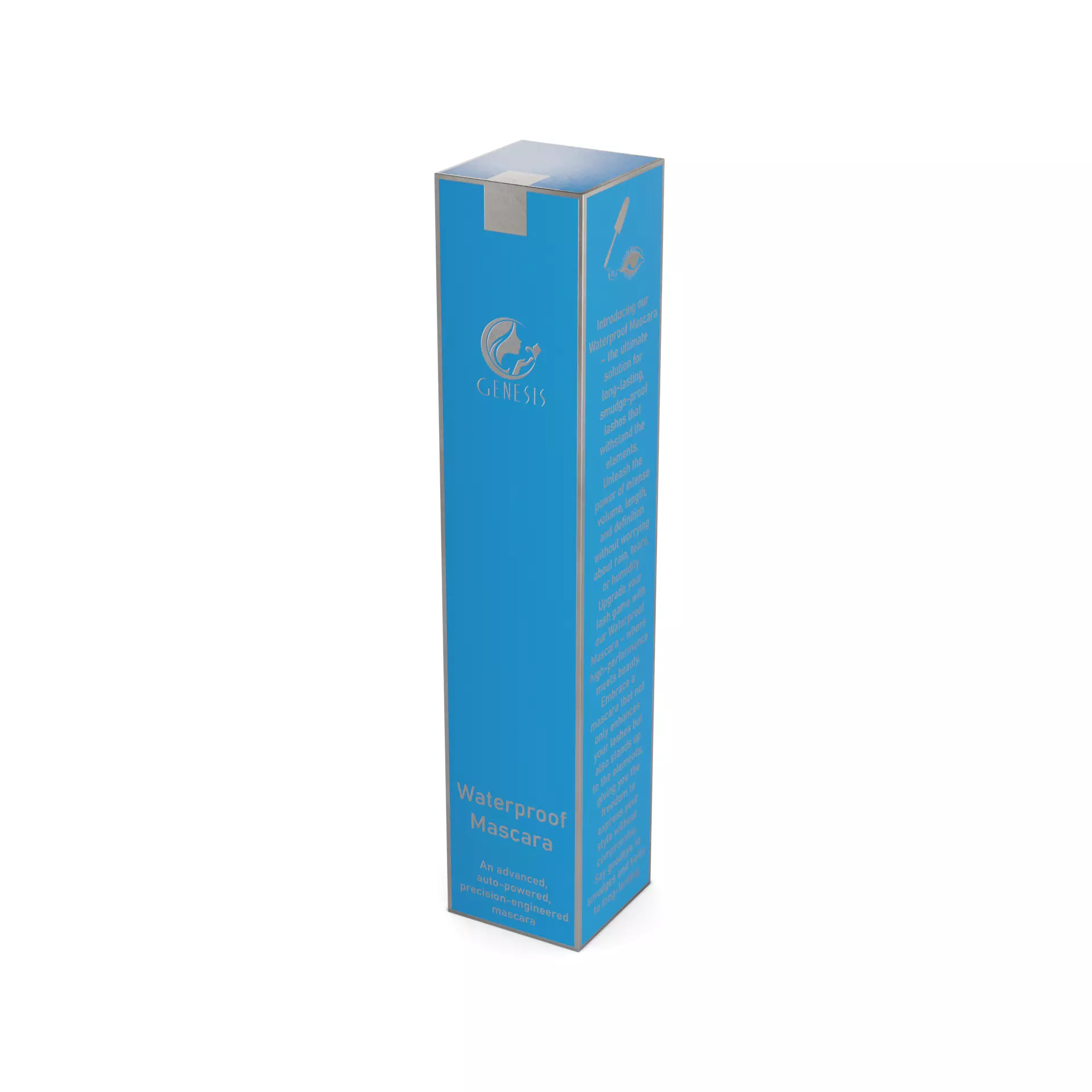 Waterproof Mascara: Stay smudge-free all day with our Waterproof Mascara. The vibrant blue tube is sealed tightly to prevent any water from seeping in. The mascara formula is waterproof and long-lasting, ensuring your lashes stay voluminous and defined even in wet conditions. The packaging includes an informational label with a graphic of water droplets and the text Waterproof Mascara for easy identification.