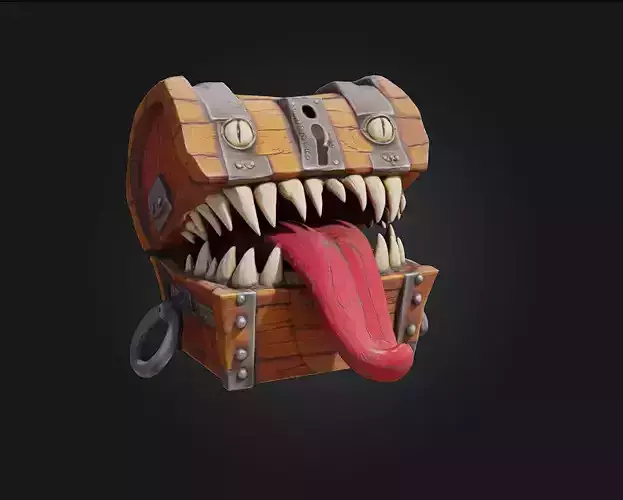 Classic wooden chest form with hidden monstrous features: sharp teeth, twisting tongue, and glowing eyes