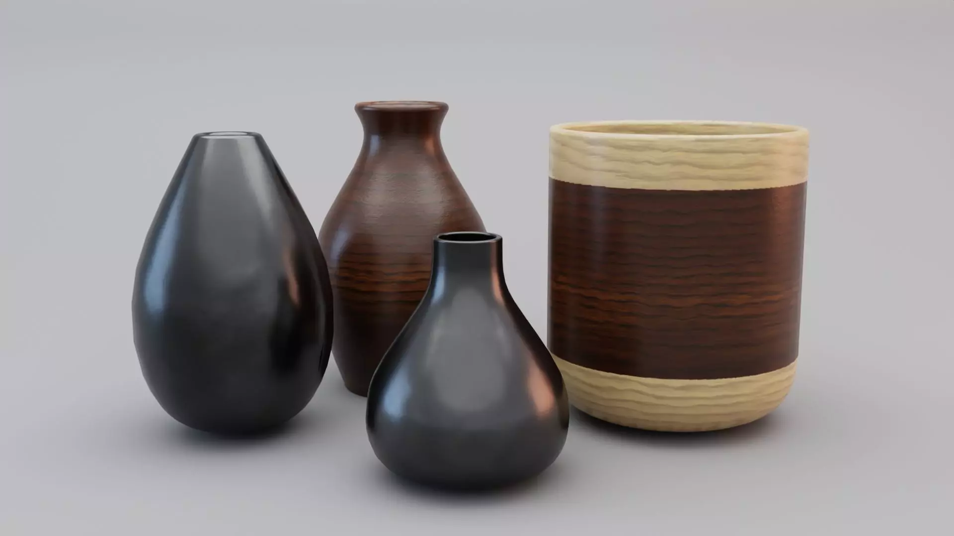 These are a realistic-looking collection of Wooden and galvanized steel Vases with included PBR flattened textures.