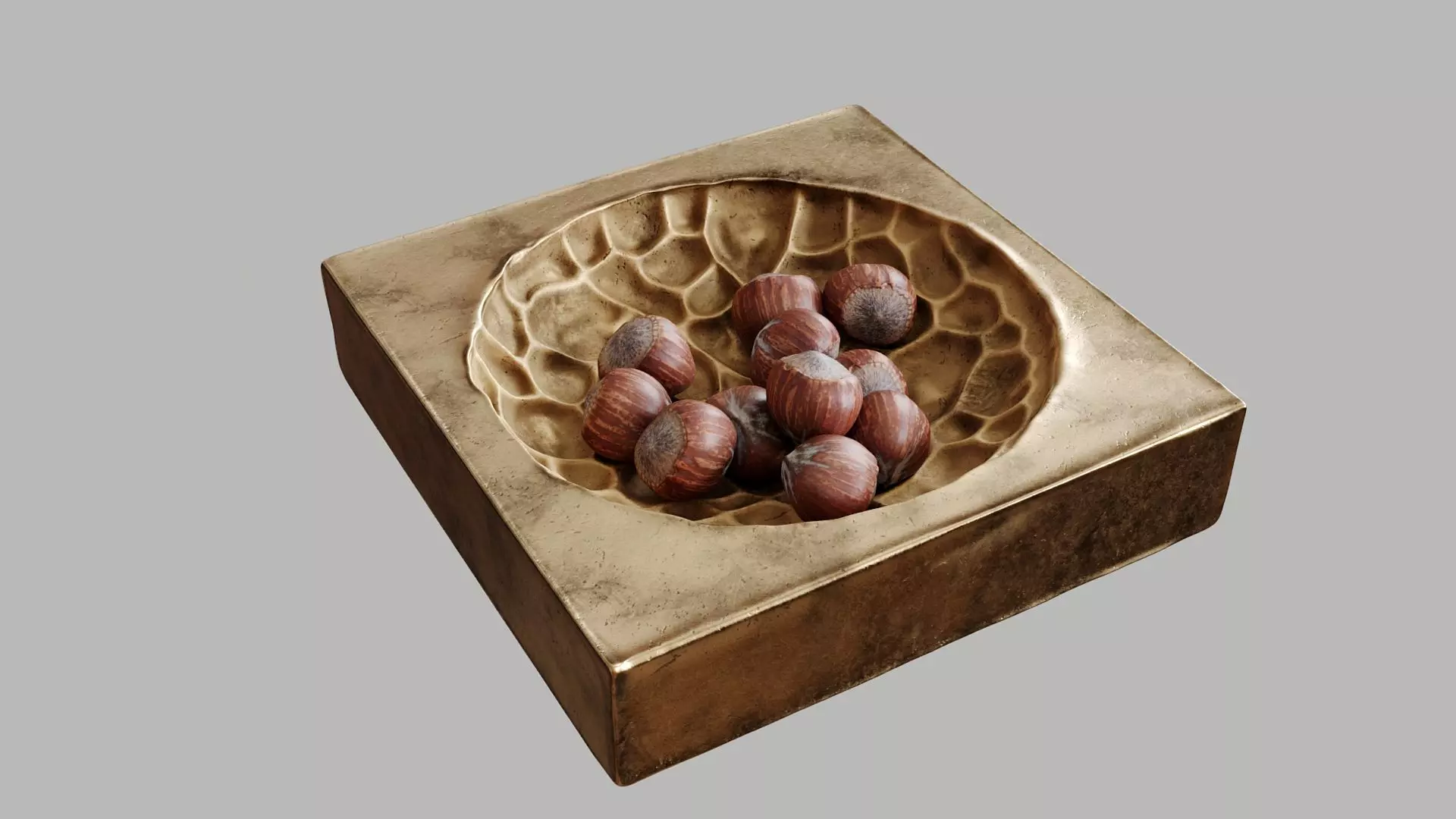 This is a 3D model of the Object Baroche, a decorative tray. The model features a square base with a circular, organic looking interior basin and an aged metallic finish. It has quad topology, is fully UVW mapped, and includes 8K texture maps. It is suitable for interior visualization as a unique decorative accent piece. Multiple file formats are provided: .max, .obj, .fbx, .abc, and more.Hazelnut (multiple copies of the same one) is included with 8K texture set.