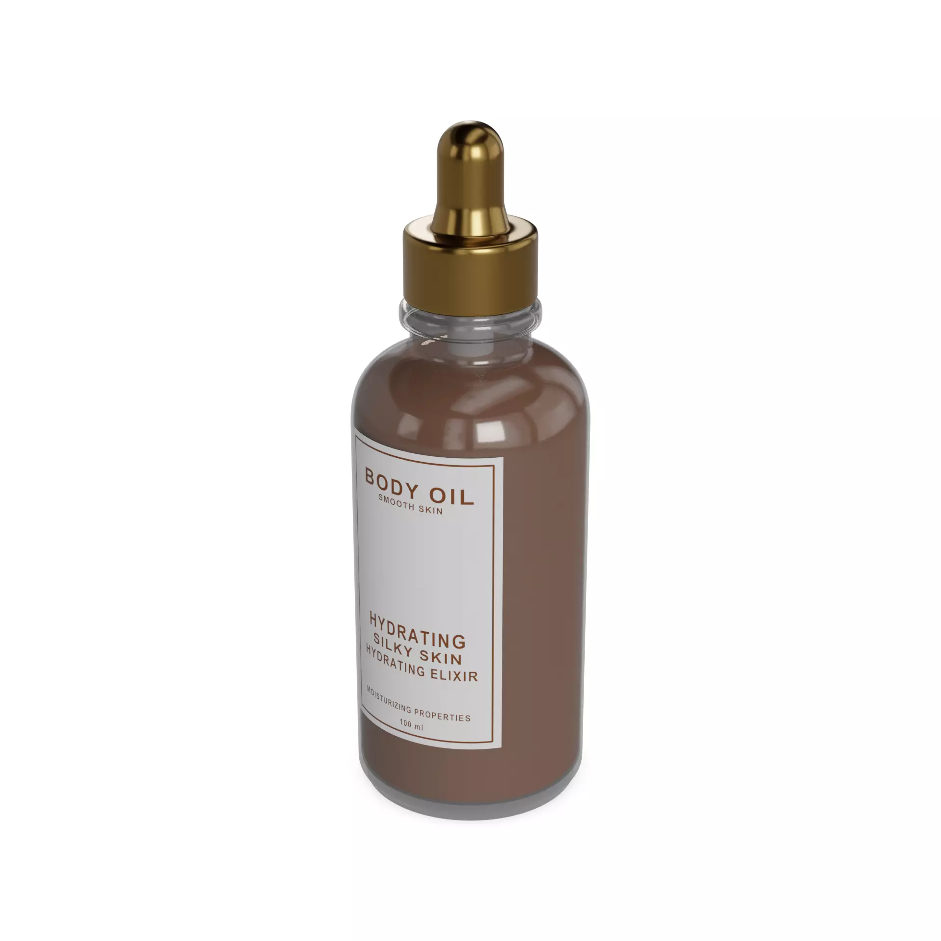 Body Oil: A sleek, glass bottle with a dropper made of gold-toned metal, exuding elegance. The bottle has a screw-on cap to prevent leakage. The label showcases a warm amber color scheme with images of nourishing oils, highlighting the body oil's moisturizing properties. Size: 100ml. Possible text labels: Hydrating Elixir, Silky Smooth Skin.