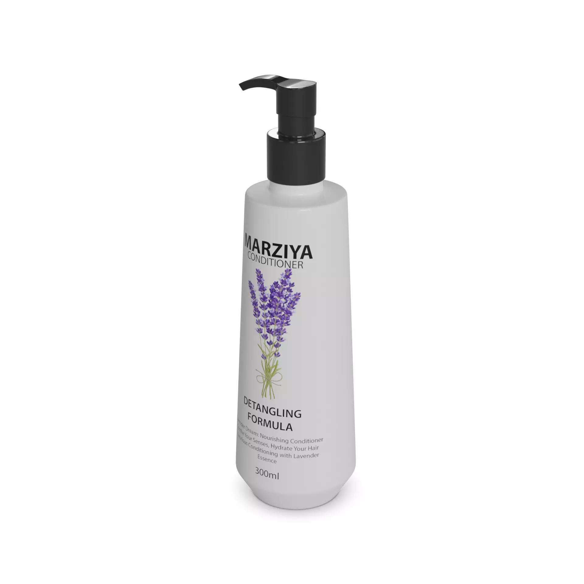 Conditioner: A sleek, oval-shaped bottle made of translucent plastic, allowing you to see the creamy conditioner inside. The bottle has a pump dispenser for mess-free application. The label features a calming lavender color scheme with illustrations of silky hair, indicating the conditioner's smoothing effects. Size: 300ml. Possible text labels: Intense Hydration, Detangling Formula.