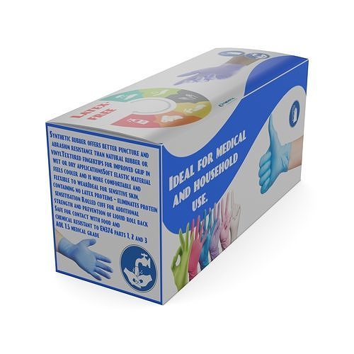 Disposable Gloves: A box of disposable gloves in various sizes. The packaging is a cardboard box with a picture of a hand wearing a glove on the front. The label includes text that reads Latex-free and Ideal for medical and household use.