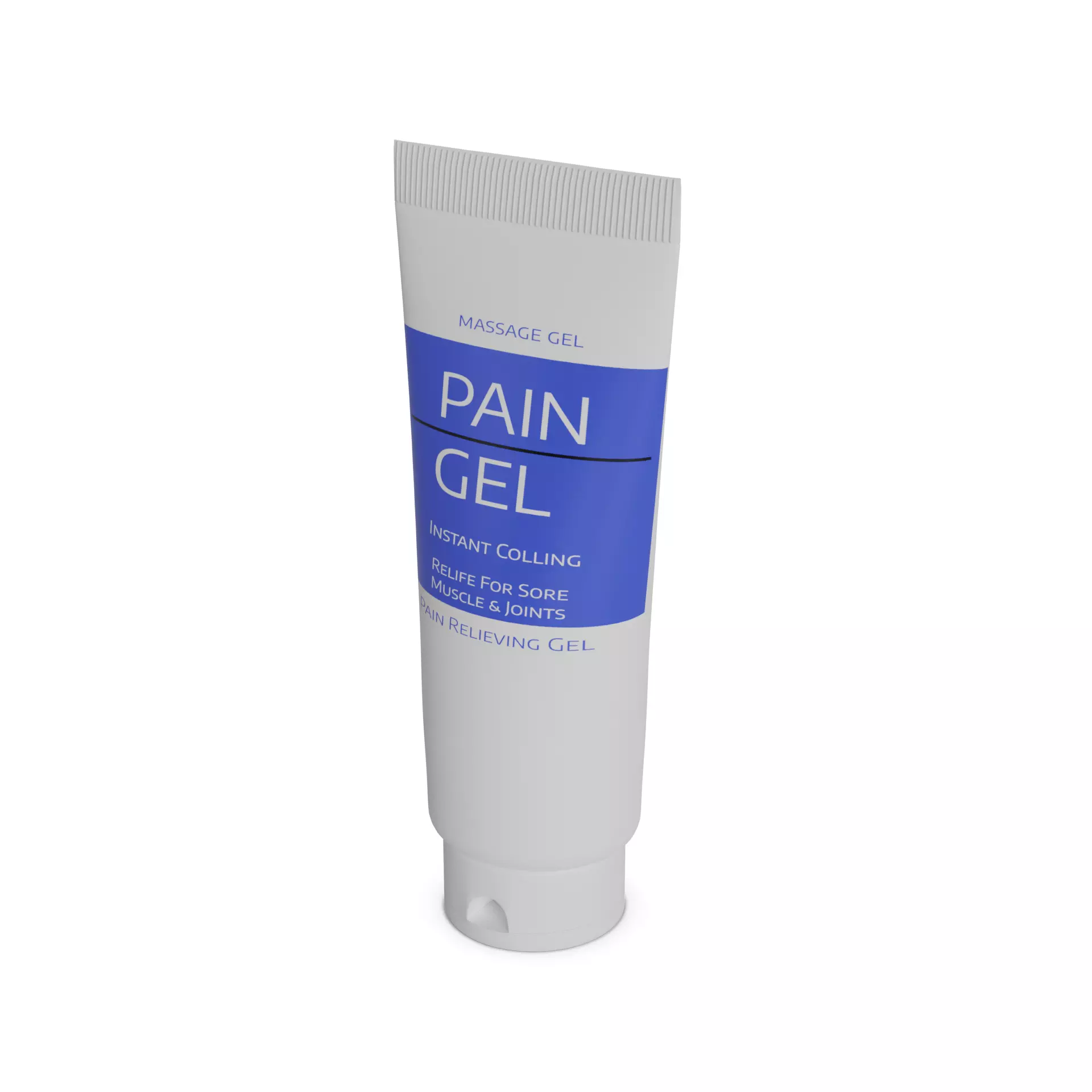 Pain Relief Gel: A tube of pain relief gel for topical application. The packaging is a squeezable plastic tube with a blue and white color scheme. It features a graphic of a person massaging their sore muscles and a label with the text Pain Relief Gel in bold letters. The tube includes information about the active ingredients, directions for use, and any warnings or precautions.