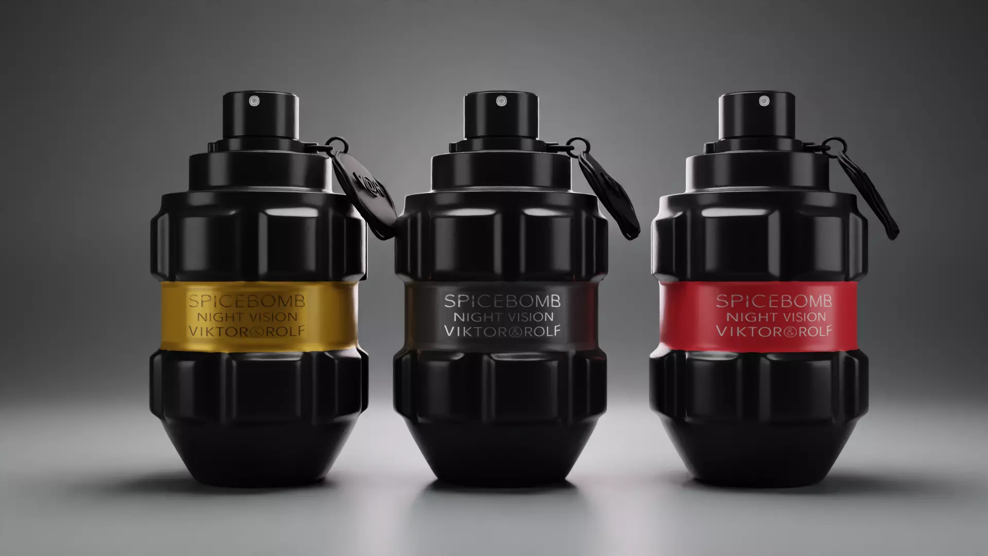 This is a high-quality 3D model of a grenade-shaped perfume bottle, inspired by the Spicebomb Night Vision fragrance by Viktor & Rolf. The design features a bold, masculine look with colored bands (yellow, red, and greenish-black) that represent different scent variations. Perfect for product visualization, advertising, branding, or packaging design.