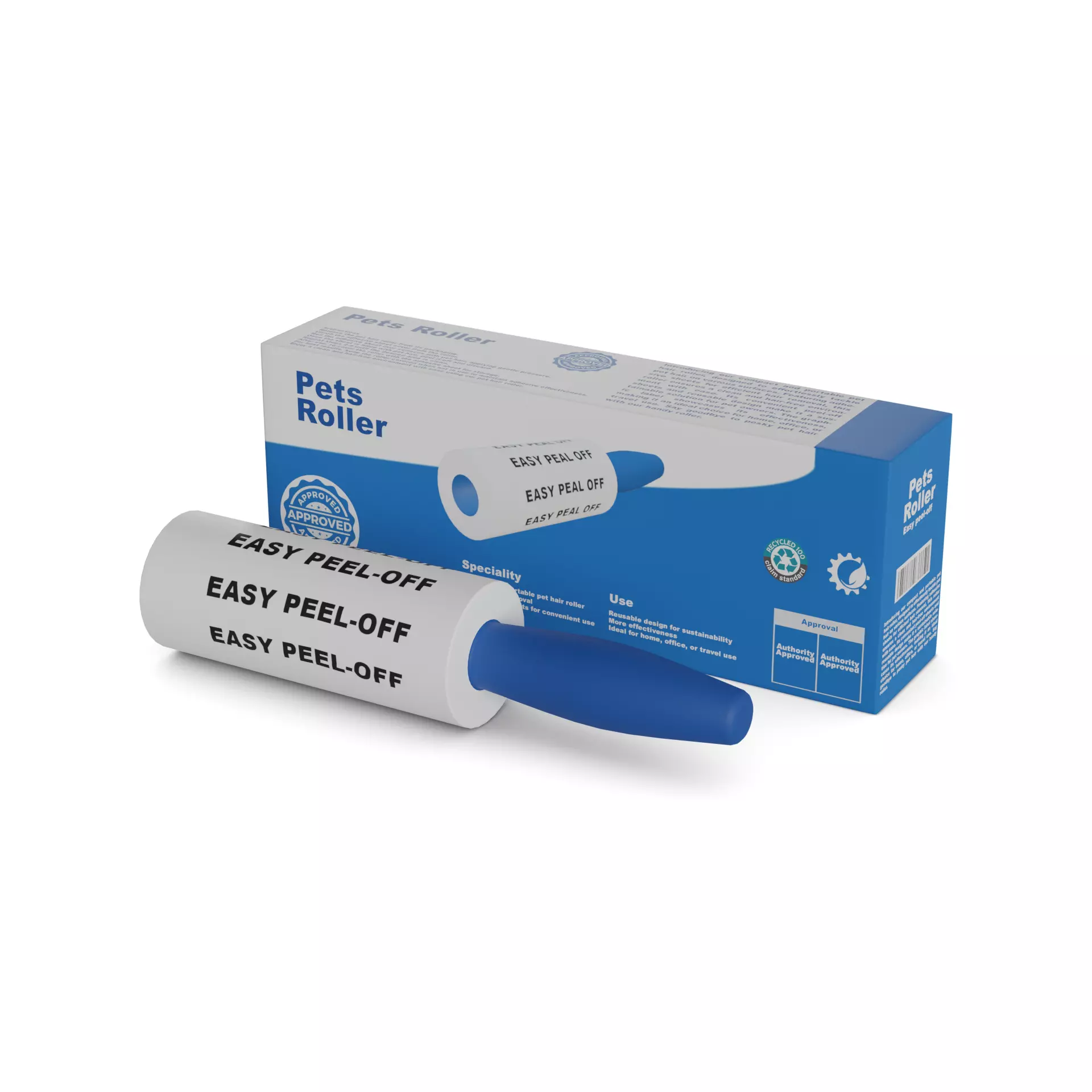 Pet Hair Roller: A pet hair roller in a compact and portable packaging. The roller is covered in adhesive sheets that effectively pick up pet hair from furniture, clothing, and other surfaces. The packaging features a label with a graphic of a roller covered in pet hair and includes text that promotes the roller's easy peel-off sheets and reusable design.