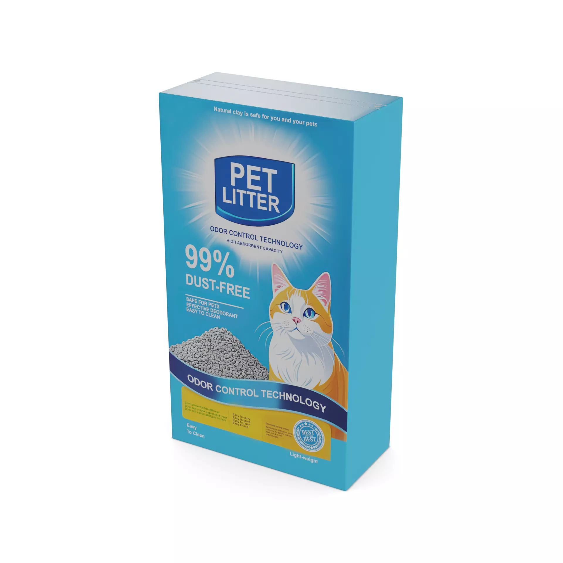Cat Litter: This premium cat litter comes in a sturdy, rectangular plastic container with a convenient handle for easy carrying. The packaging features a vibrant blue color scheme, with a playful illustration of a happy cat on the front. The container holds 10 pounds of highly absorbent litter, ensuring long-lasting freshness for your furry friend. The label includes helpful text such as 99% dust-free and odor control technology to highlight the product's benefits.