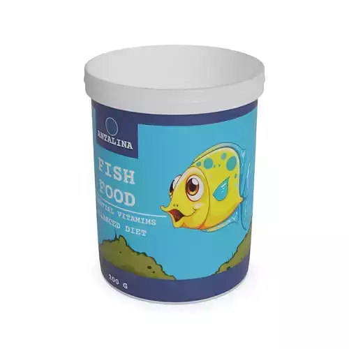 Fish Food: Ensure your fish stay healthy and vibrant with this high-quality fish food. The packaging comes in a sleek, rectangular plastic container, featuring a calming blue color scheme. The container holds 200 grams of nutritious fish flakes, sealed for freshness. The label includes text such as essential vitamins and balanced diet to inform customers about the product's nutritional value. A graphic of a colorful fish swimming happily adds a visual touch to the label.