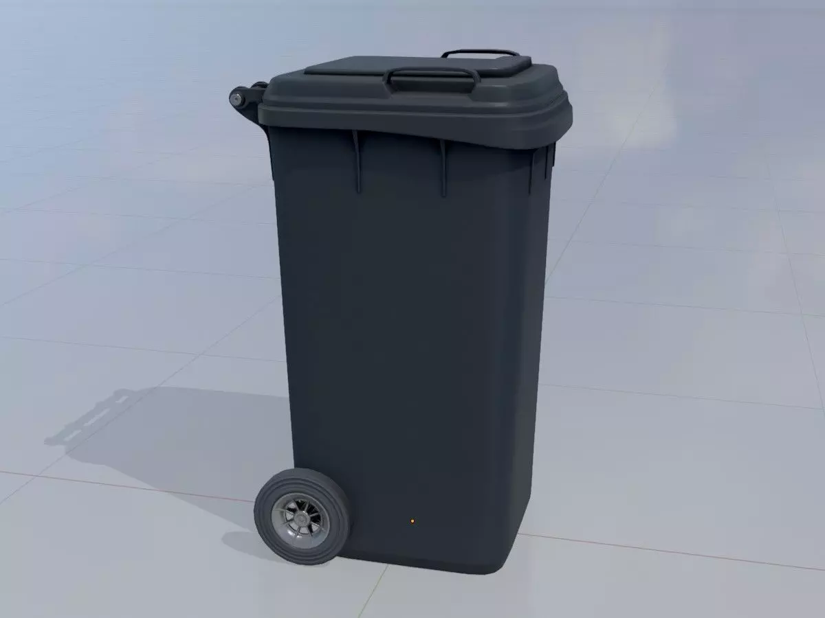 • Here you can see a 3D model of a black plastic garbage can with wheels and a capacity of 240 litres.