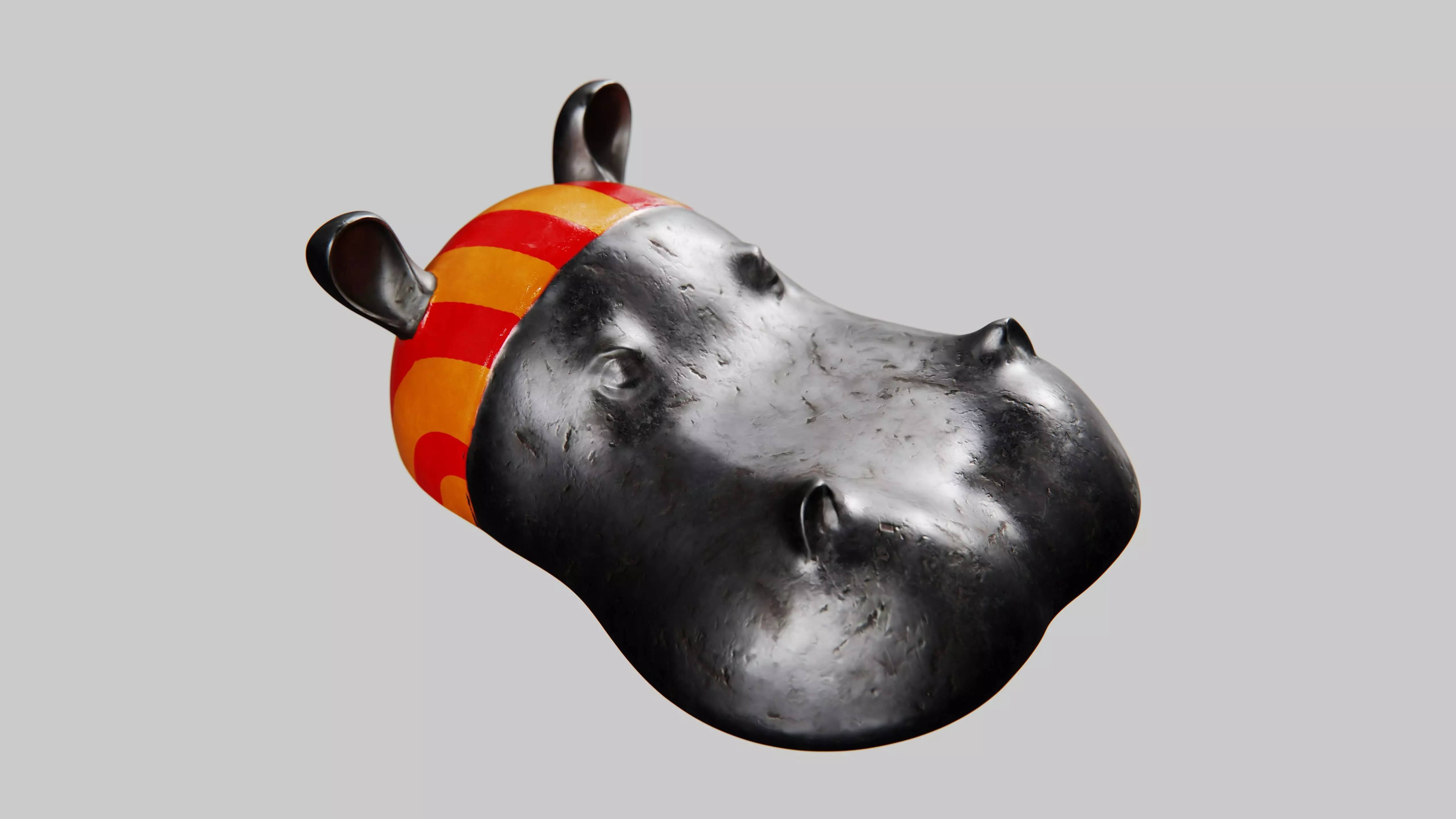 This is a 3D model of a playful hippopotamus head sculpture, featuring a textured, metallic-like finish and a colorful striped headband detail. The model has quad topology, is fully UVW mapped, and includes 8K texture maps. It is suitable for interior visualization and decorative purposes. Multiple file formats are provided: .max, .obj, .fbx, .abc, and more.