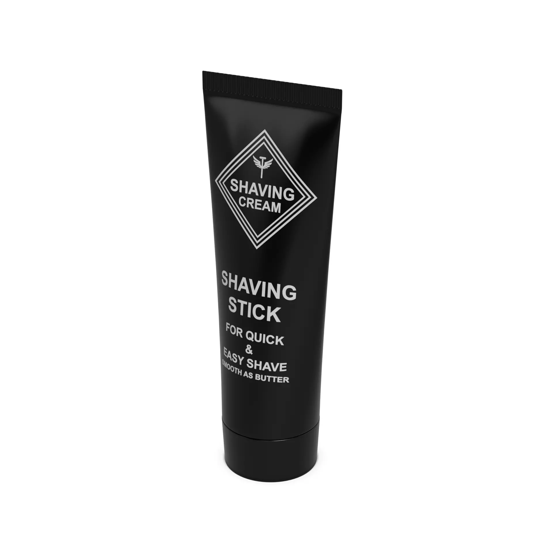 Shaving Stick: A solid shaving stick that can be applied directly to the skin for a quick and easy shave. The stick comes in a slim, black plastic tube with a twist-up mechanism. The packaging features a label with the product name and a graphic of a clean-shaven man. The stick contains 50g of product, perfect for travel or daily use.