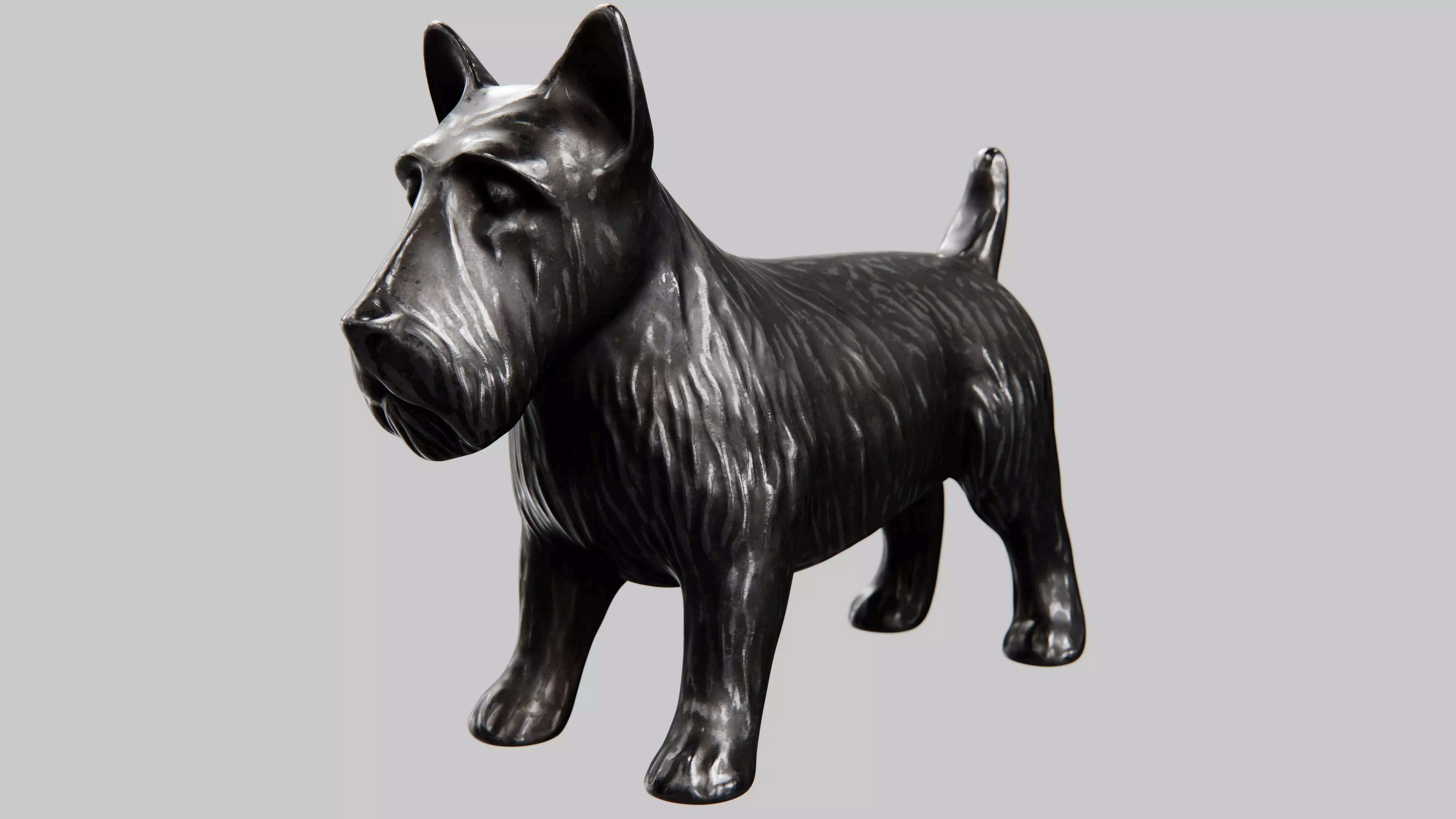This is a 3D model of a Scottish Terrier (Scottie) dog statuette, featuring a textured finish of aged metal. The model has quad topology, is fully UVW mapped, and includes 8K texture maps. It is suitable for interior visualization and decorative purposes. Multiple file formats are provided: .max, .obj, .fbx, .abc, and more.