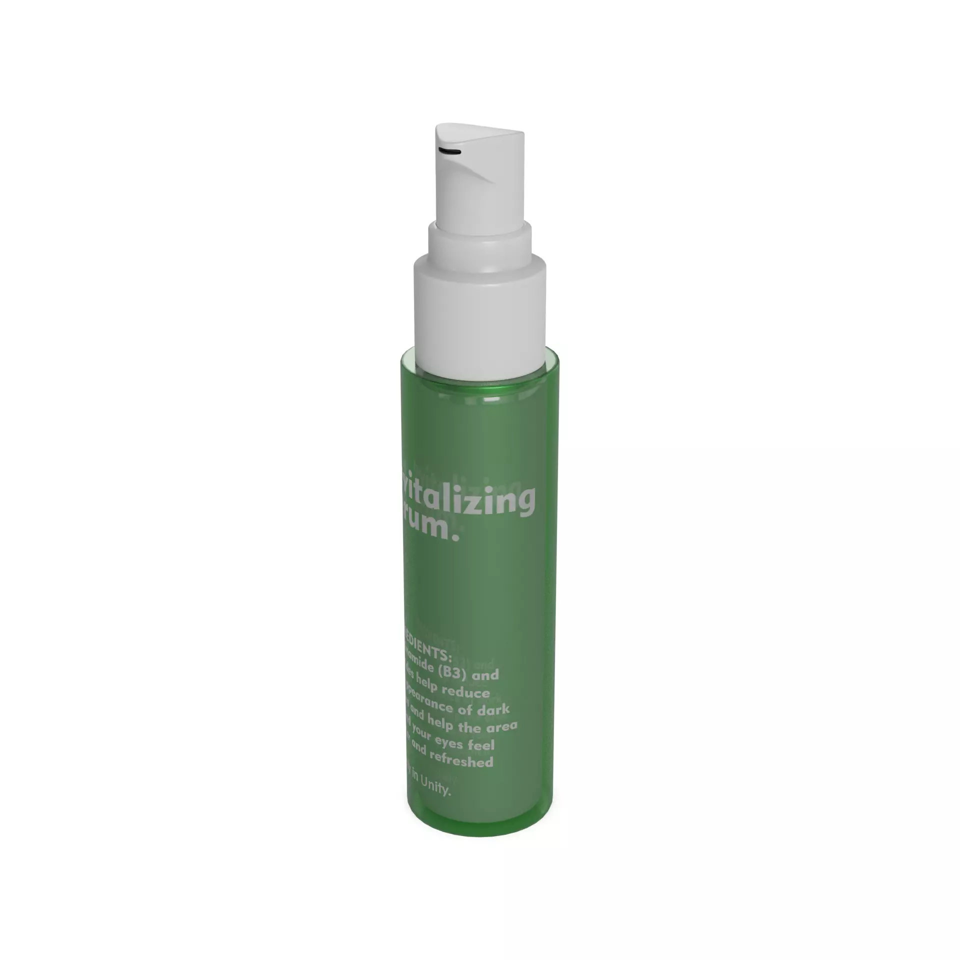 Revitalizing Serum: This revitalizing serum comes in a tall, slender bottle made of clear plastic, allowing you to see the vibrant green liquid inside. The serum is infused with natural botanicals and vitamins to rejuvenate and energize your skin. The label showcases a leaf graphic and the text Revitalizing Serum in fresh, green letters.