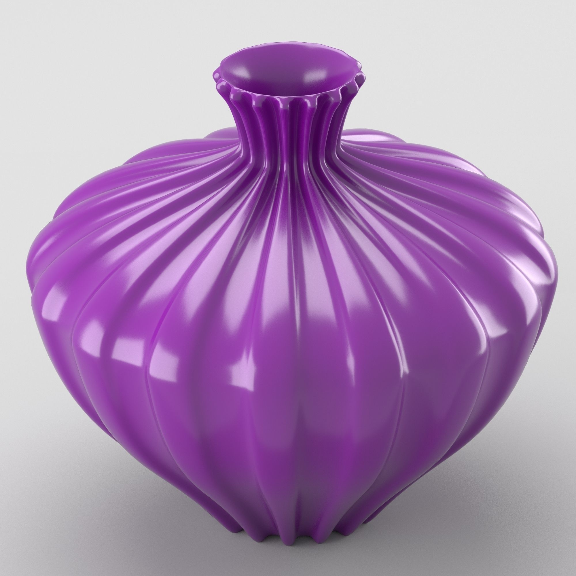 Shiny decorative vase in purple tones=====================Modeled in Blender 2.74.5 with .blend file format. Rendered with Cycles.Also available in .obj, .fbx, .stl and .dae file formats (which do not include materials and the scene, only the model itself). =====================Blender scene (.blend) contains the vase and the scene (three light sources, a camera and a backdrop). The scene is ready for render with materials applied ("F12") . =====================Polygon count:Without scene - 34048 polygons,34050 vertices.With scene - 34819 polygons,34895 vertices.
