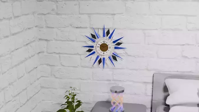 This modern spiked wall clock combines bold geometric design with refined metallic details to create a distinctive centerpiece for any room. The clock features radiating metal rods, each tipped with decorative vanes in alternating shades of dark blue, black, and white. The vanes catch the light beautifully, giving the piece depth and visual movement from every angle. Brass accents provide a warm contrast to the cooler tones, highlighting the craftsmanship and adding a subtle touch of elegance. At the center, a clean white clock face displays precise black markings and slender black hands, ensuring clear readability and a balanced aesthetic. Designed to complement a wide range of interior styles, this piece fits seamlessly in modern, contemporary, or mid-century inspired spaces. Perfect for use in living rooms, offices, or entryways, this clock brings both functionality and sophisticated style to your décor.