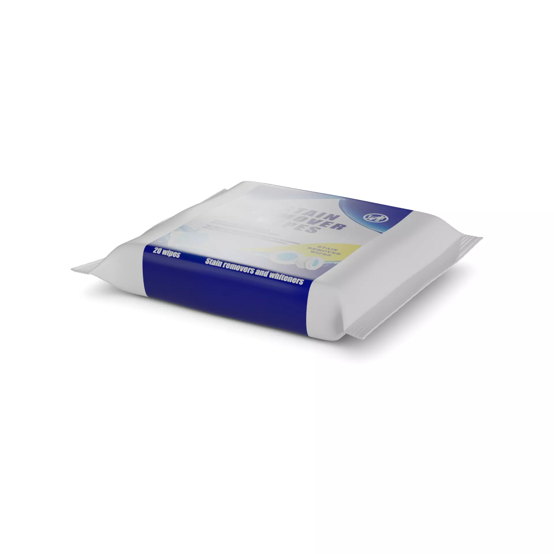 Stain Remover Wipes: Remove stains effortlessly with these convenient stain remover wipes. The wipes are individually packaged in a resealable foil packet, ensuring freshness and portability. The packet features a vibrant label with a picture of a stain being wiped away, along with clear instructions for use. Size: 20 wipes.