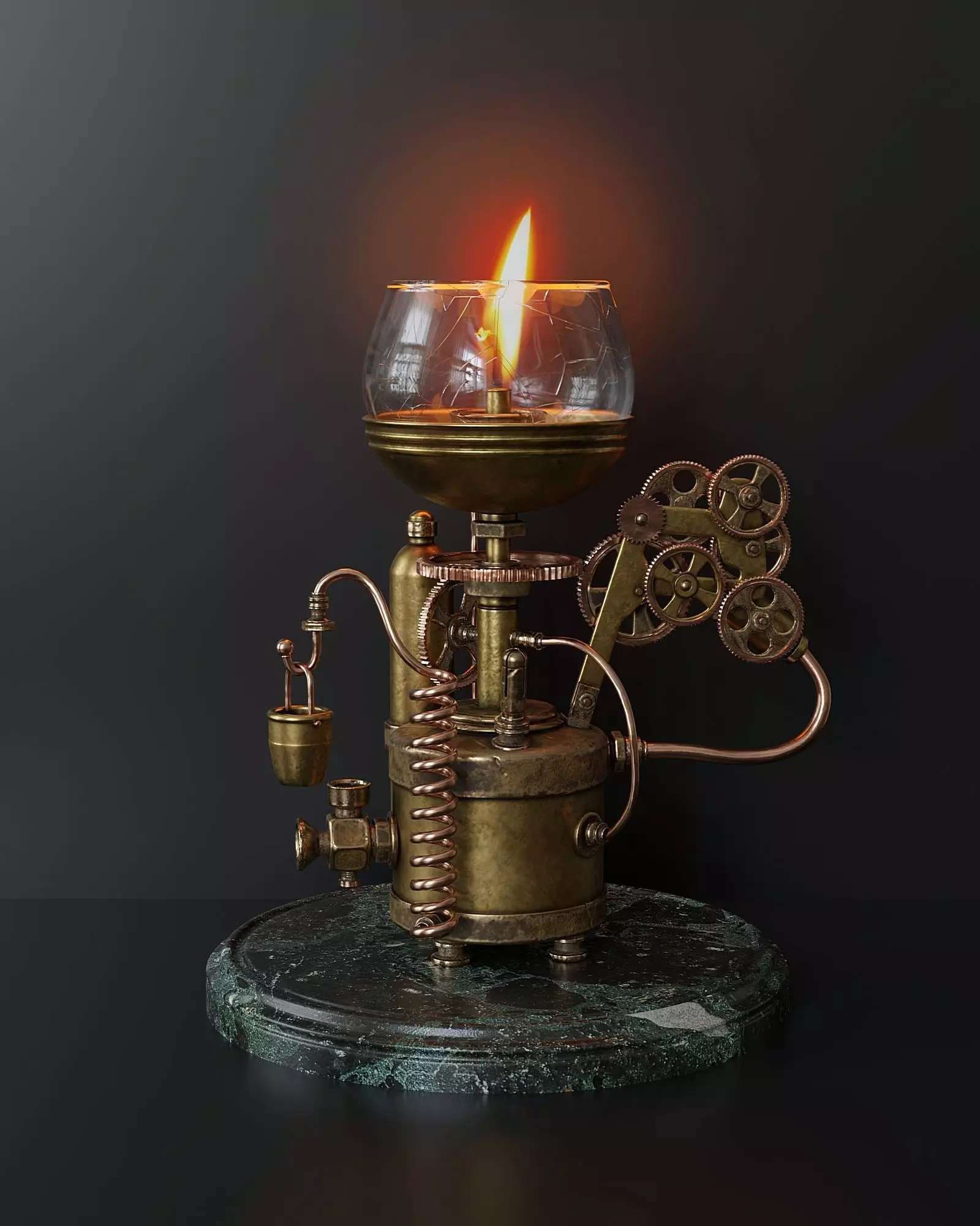Steampunk decorative table lamp. The model consists of two objects: a lamp and a marble stand ( + a polygon (png image with a flame) and an attached flame illumination lamp (point )) (All bindings are only in the blend format file; in other formats, objects have no binding to each other) Materials (resolution 2048x2048) are made in the substance painter program. All textures are packed in a zip archive. In the second zip archive the textures of marble and flame.