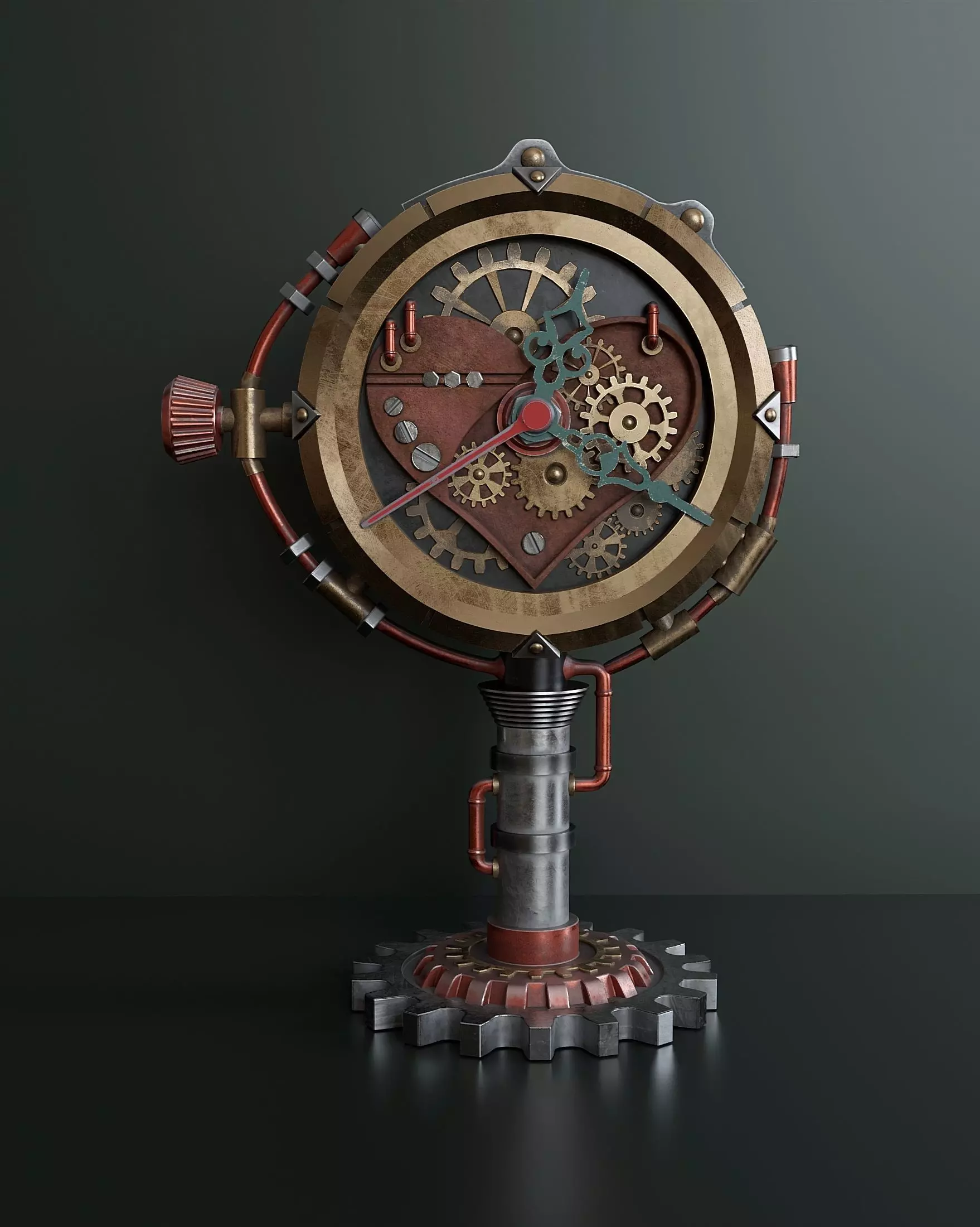 Table clock in steampunk style. The model consists of a main body and a minute, hour and second hands. (objects are not tied to each other) All textures (resolution 4096x4096) were made in the Substance Painter program and packed in a zip archive.