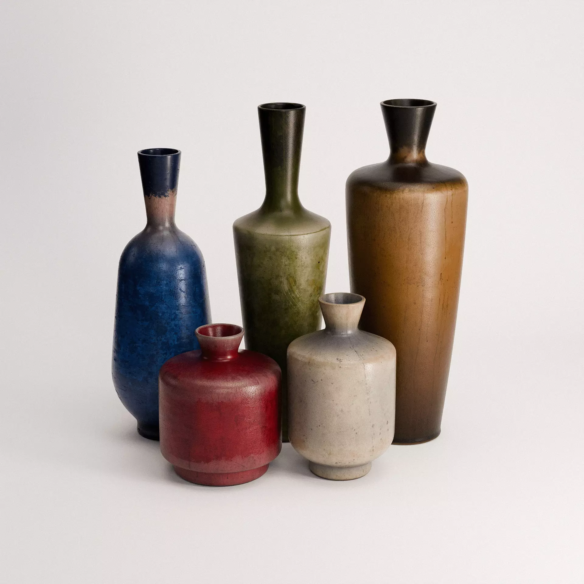 The Stoneware Vases Set 01 presents a beautifully curated collection of five distinct ceramic vases, each with unique shapes, rich textures, and an earthy, weathered patina. Featuring a diverse palette of deep reds, blues, greens, and neutrals, this set blends rustic charm with timeless elegance, making it perfect for interior design visualizations, still-life compositions, and high-end décor renders. Crafted with high-resolution PBR textures, each vase captures the subtle imperfections of aged stoneware, from surface wear to color variations, ensuring maximum realism. Whether used as standalone pieces or as part of a larger scene, this set brings warmth and authenticity to any 3D project.
