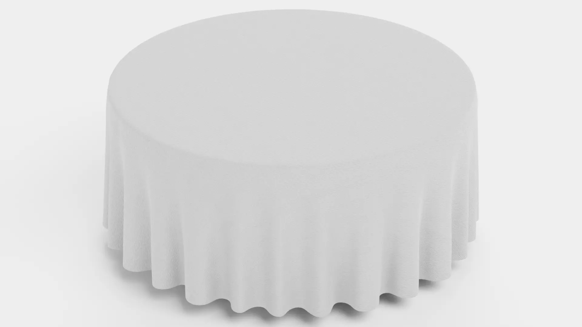 A round white tablecloth designed as almost a floor-length linen fabric asset with an emphasis on formal presentation and textile structure. The extended length allows the fabric to fall close to the ground, forming consistent vertical folds that reflect the orderly arrangement typical of event and dining environments. Fine woven fiber detail supports a credible textile identity, while the clean, neutral surface maintains strong versatility across different interior styles. Functions as a furniture cover, presentation element, or foundational display layer in home dining setups, wedding receptions, banquet arrangements, or formal event scenes.