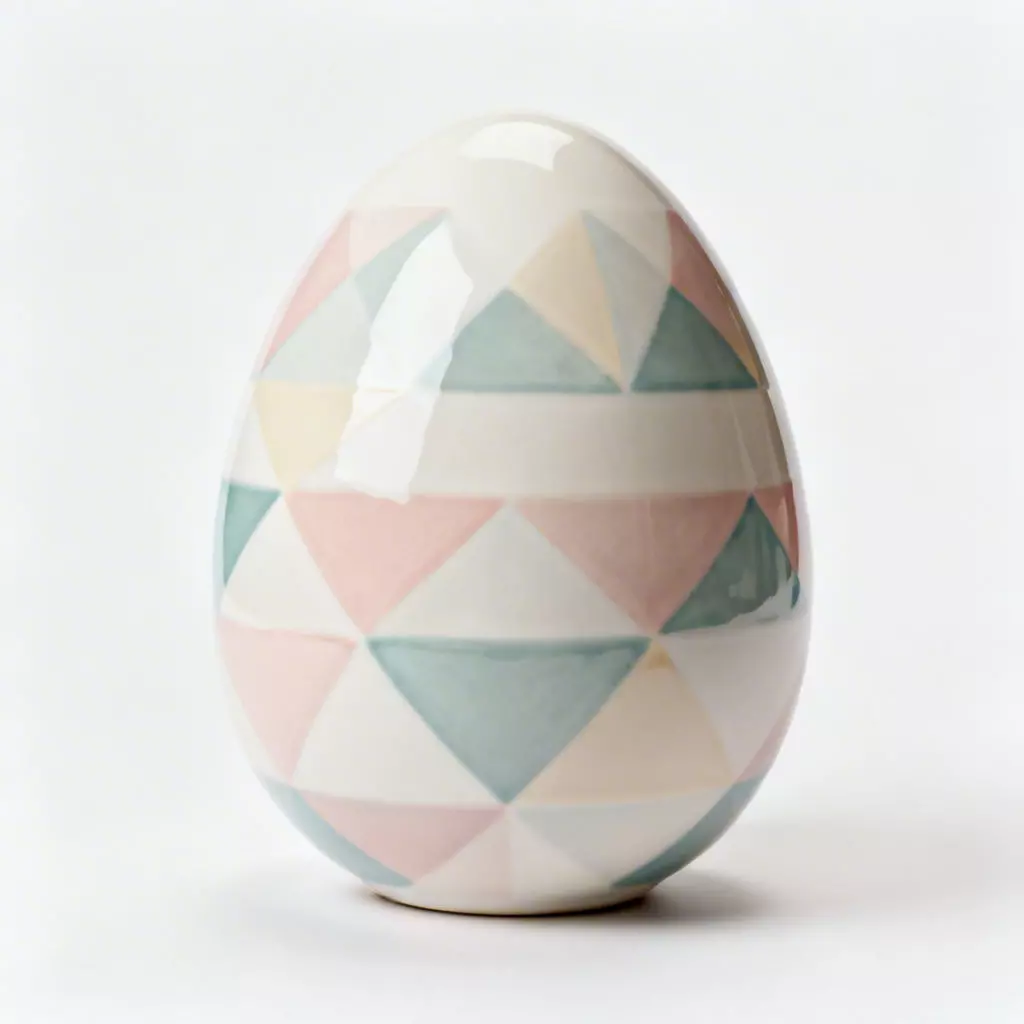 Geometric Prism PatternThe egg is decorated with a sophisticated array of interlocking triangles. The pattern uses a soft, contemporary color palette of blush pink, sage green, and pale yellow, giving the traditional Easter egg a fresh and artistic Art-Deco vibe.
