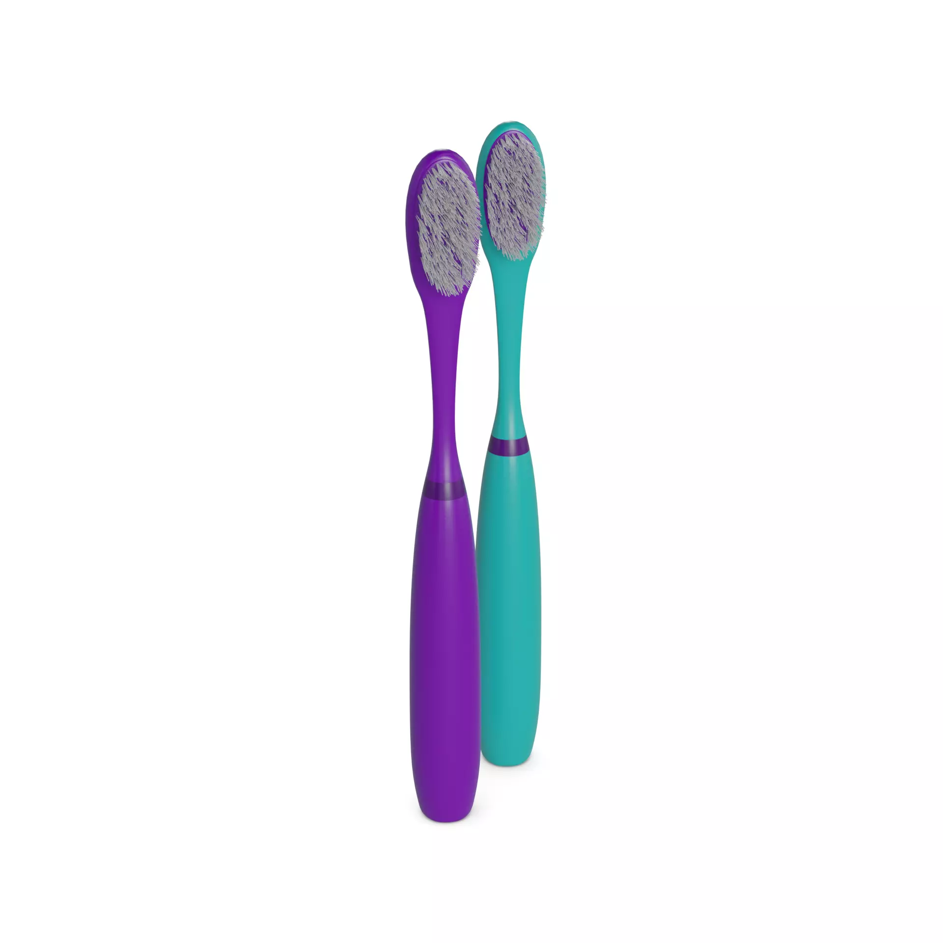 Toothbrush: This toothbrush set includes two toothbrushes, one in a vibrant purple color and the other in a soothing teal color. The handles have a rubberized grip for comfortable brushing. The bristles are angled for better reach and cleaning. The packaging is a recyclable cardboard box with a clear plastic window, showcasing the colorful toothbrushes. The label on the packaging displays a toothbrush and the text Dual Color for a stylish oral care experience.