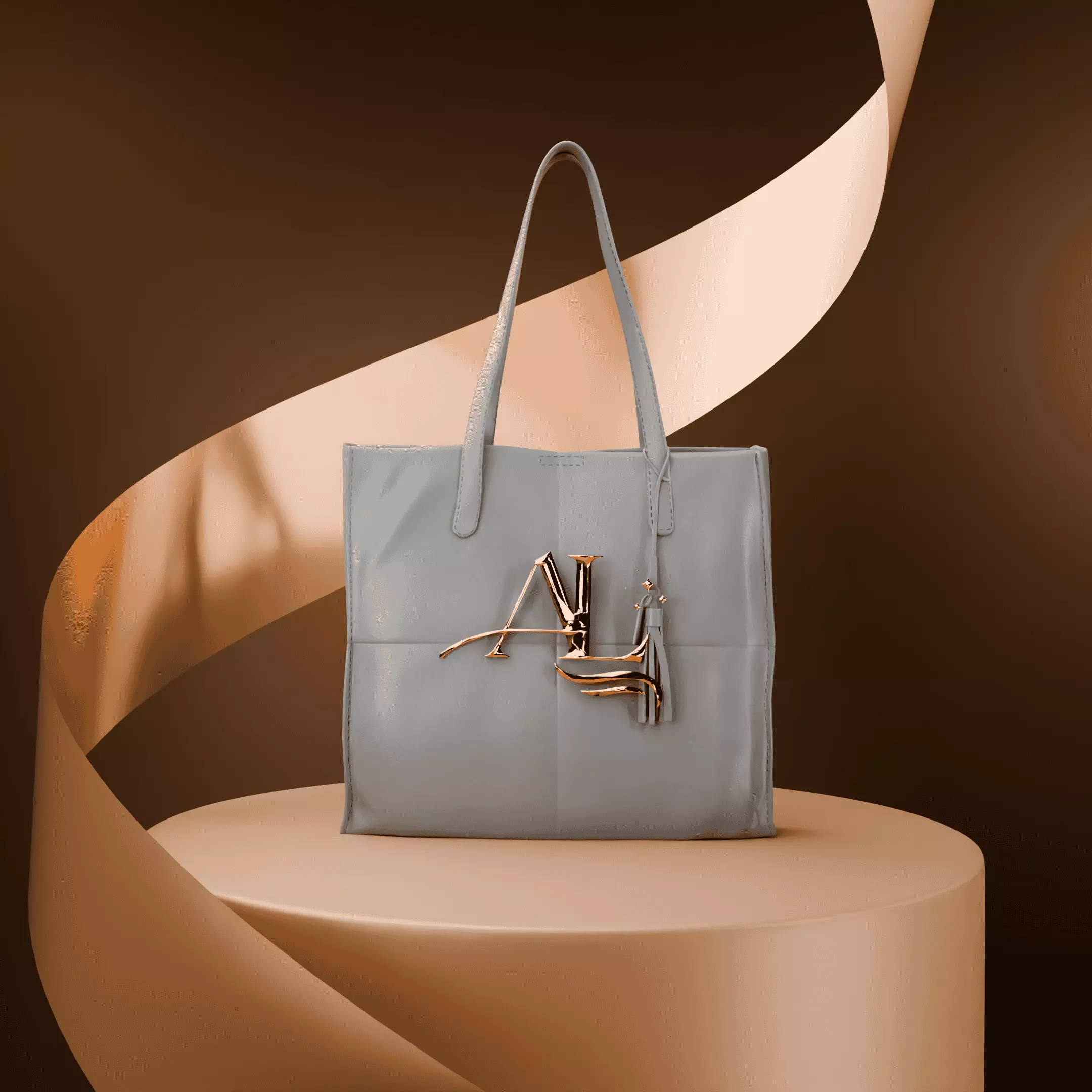 The background consists of a warm, gradient brown tone with a flowing ribbon-like structure that enhances the luxurious aesthetic. The bag is placed on a round, beige pedestal, contributing to the high-end presentation. The lighting is soft and diffused, emphasizing the handbag's contours and details without harsh reflections.