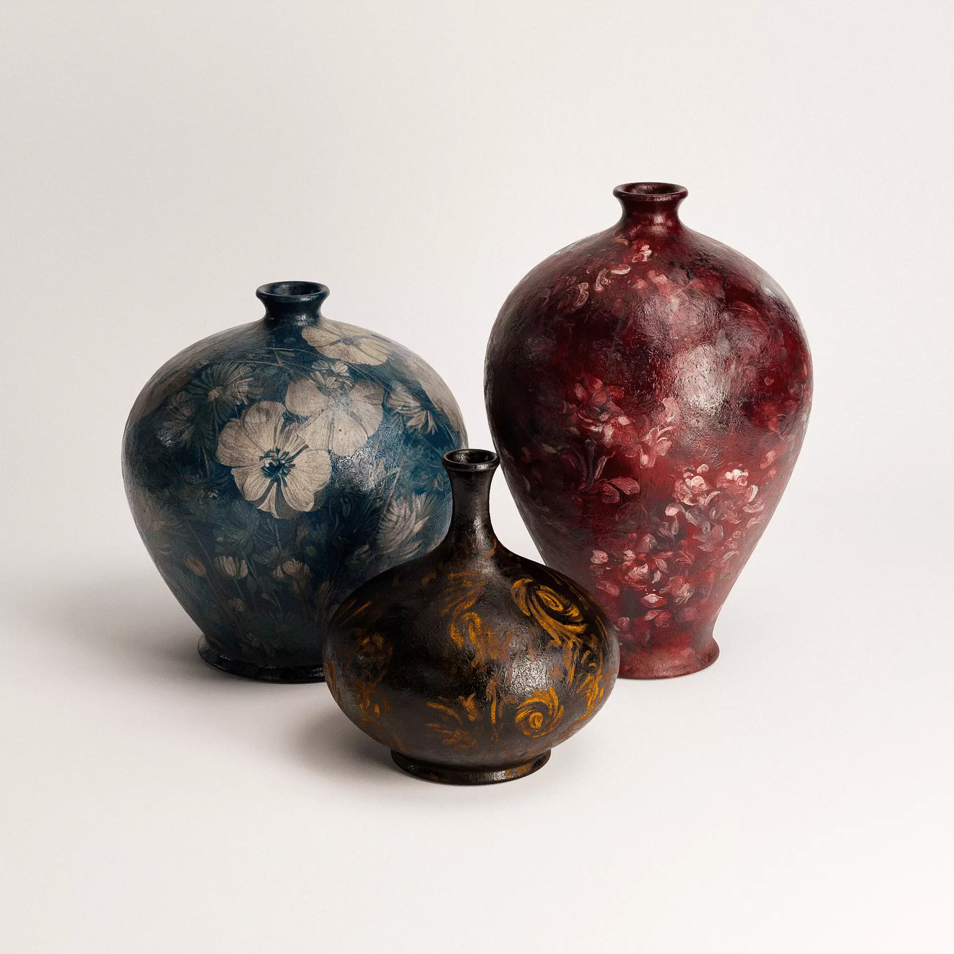 Vintage Pots Set is a richly textured 3D trio of decorative vessels, each featuring a unique floral motif and timeworn ceramic finish. The set includes three distinct forms: a rounded black pot with golden rose-like flourishes, a mid-sized blue vessel adorned with delicate white wildflowers, and a tall, deep red piece with intricate brushwork and a subtle patina. Designed with realism and character in mind, each pot showcases variations in gloss, wear, and color saturation that reflect handcrafted artistry and age. Perfect for interior visualizations, still-life scenes, or antique-inspired settings, this set adds depth, cultural charm, and visual warmth to any 3D composition.