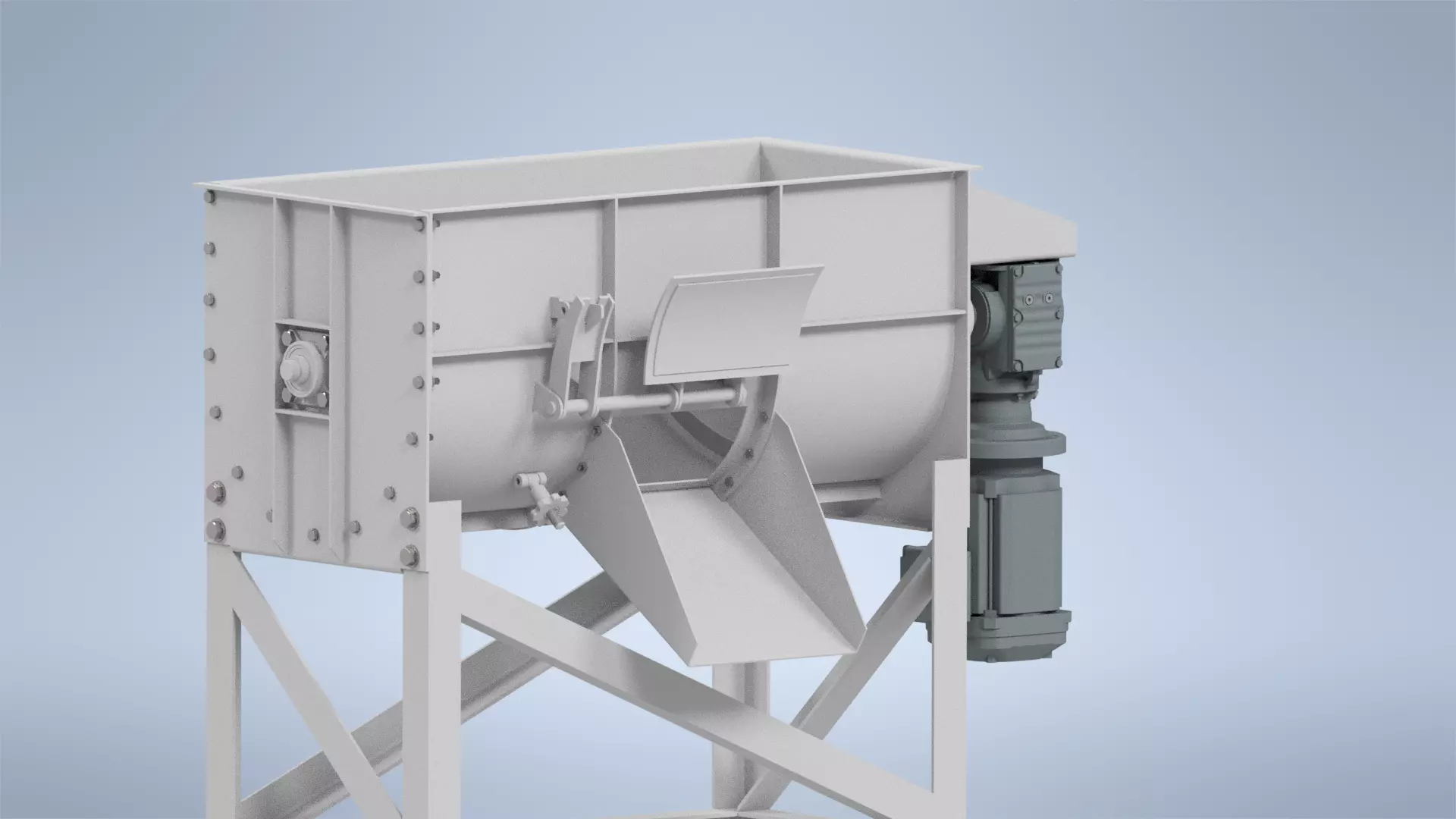 The mixer uses a double ribbon agitator that moves material in opposite directions to achieve fast and uniform mixing.