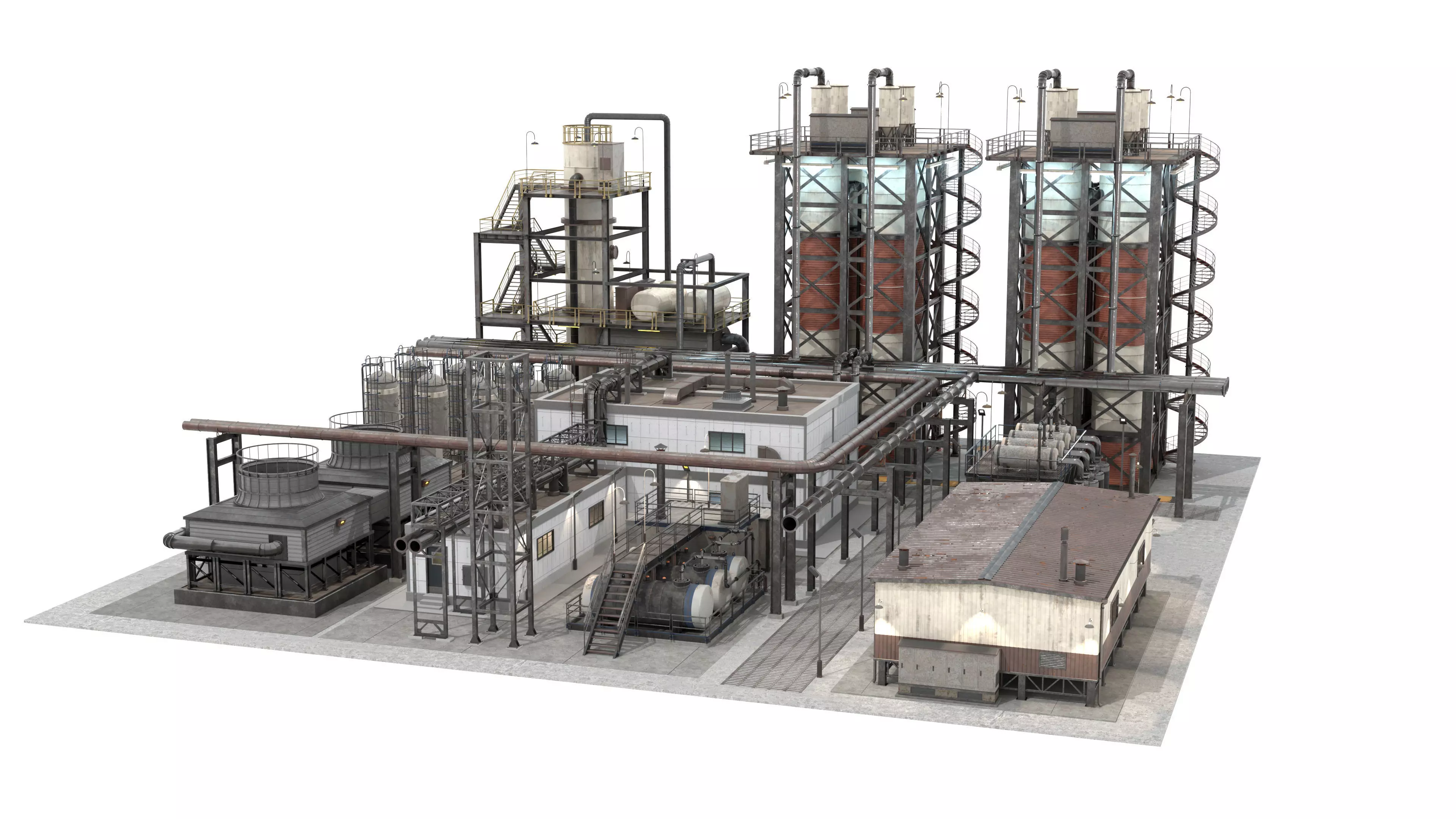 - Realistic lattice-style pipe bridges connecting all major units.
