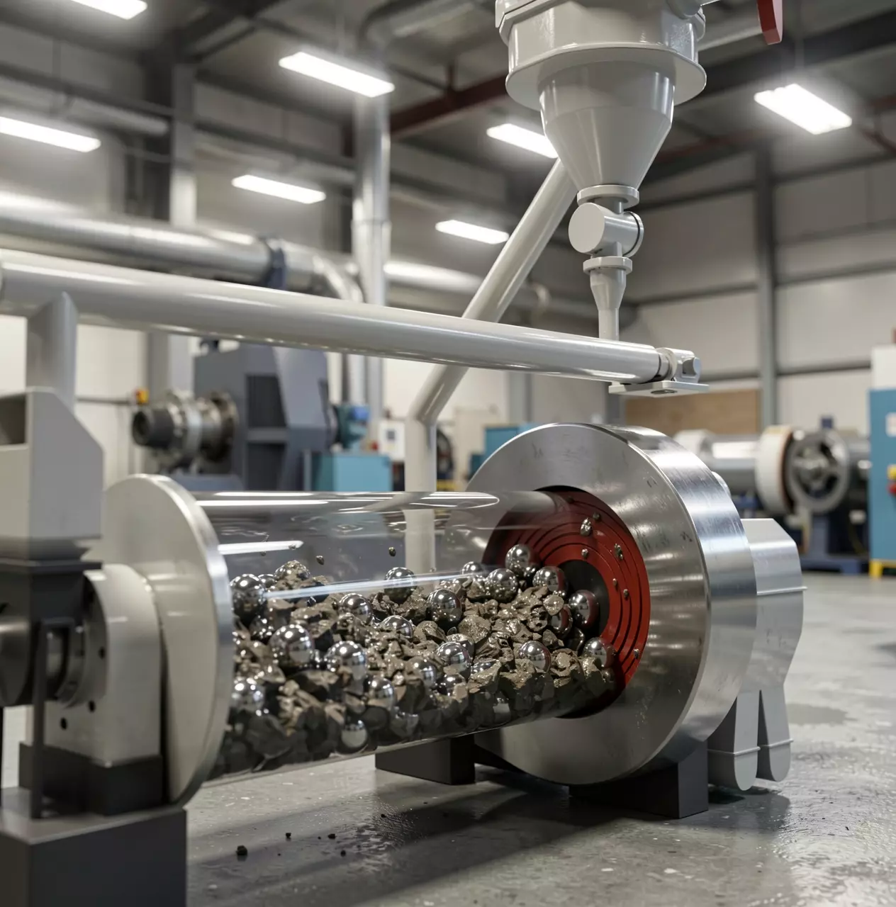 Overview:This is a highly detailed, professional-grade 3D model of an Industrial Ball Mill and Air Classifier System. The model features a transparent cutaway view showcasing a realistic internal grinding process, complete with a dynamic collision animation of rocks and grinding balls inside the rotating barrel.