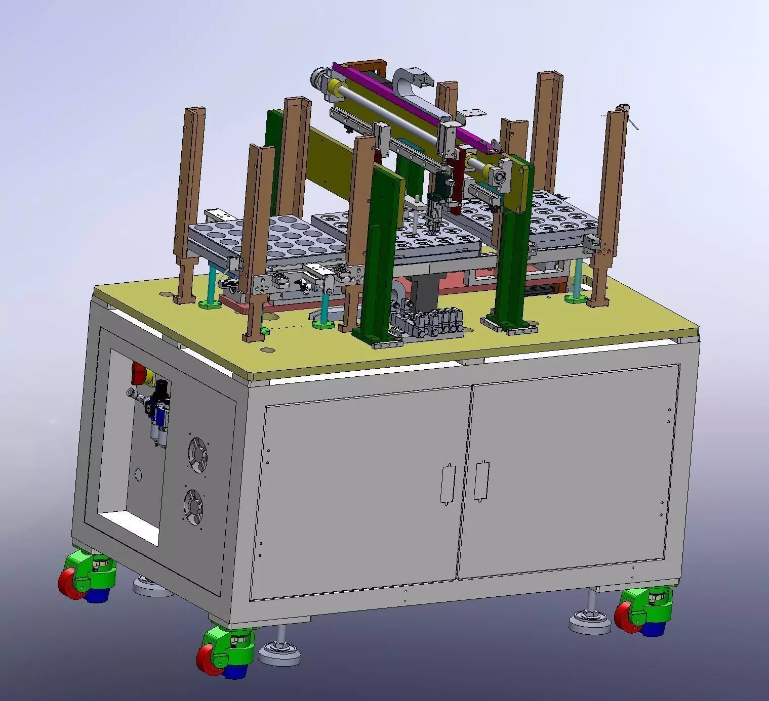 Auto stacking loading and unloading machine,The machine is used to lift up and down the tray tray with the lifting mechanism of the tray tray. The device USES the lead screw horizontal movement mechanism to transfer the tray to feed. The dividing mechanism separates the tray tray through the push mechanism of the cylinder to form the movement of loading and unloading on the tray tray
