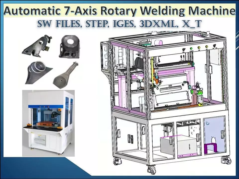 High-detail full automatic 7-axis rotary welding machine 3D CAD model designed as a dedicated welding system for high-volume, repeatable production. The rotary welding station delivers higher throughput, lower installed cost, and simpler maintenance compared to robotic welding cells—ideal for facilities prioritizing reliability and efficiency.Key Features• 7-axis automatic welding system for complex weld paths• Rotary welding station optimized for continuous production• Fixed or oscillating welding torch to cover wider weld areas• Multiple rotary configurations based on floor space and weld constraints• Design allows gravity-assisted welding for improved weld quality• Robust, industrial structure for long-duty cycles• Operational Advantages• Higher throughput than standard robot welding cells• Lower installation and ownership cost• Simple setup and operation—minimal skilled manpower required• Easy maintenance for factories with limited high-tech support• Ideal for welding the same part repeatedly in large quantitiesTypical Applications• Automotive and auto-component welding• Mass production welding lines• Dedicated fixture-based welding systems• Heavy fabrication and industrial assemblyThis CAD model is ideal for manufacturing engineers, welding system designers, and OEM automation teams seeking a cost-effective, reliable alternative to robotic welding for repetitive production.