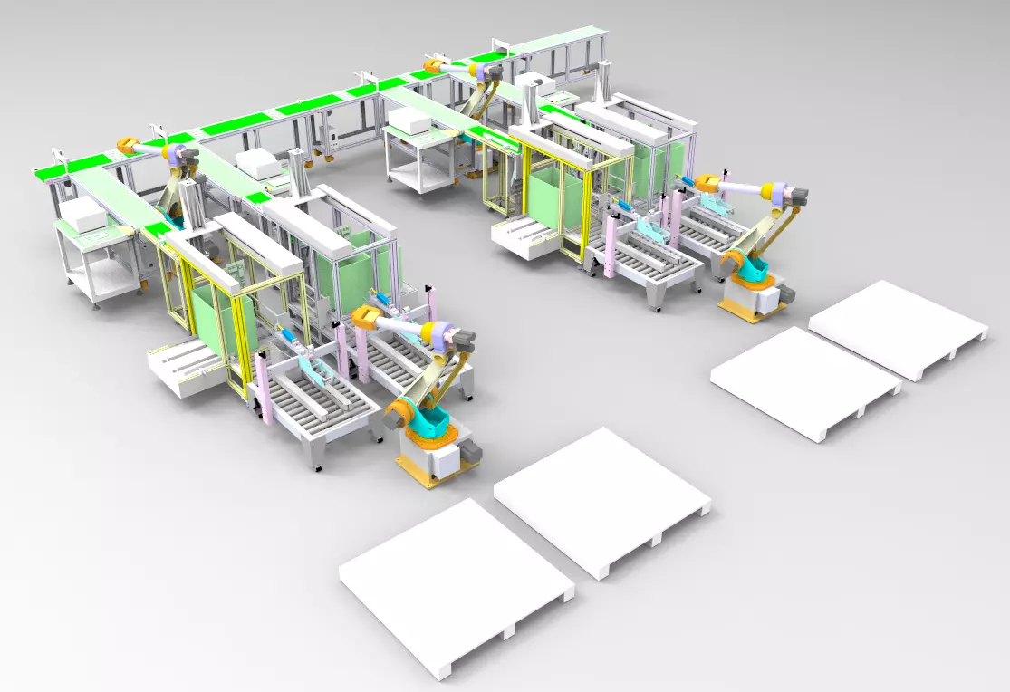 The PCB board is discharged evenly from the placement position by manual; it is recognized by the CCD to reach the designated feeding position and enters the small line body; then it is picked up by the robotic arm for detection, and the detection is completed. The NG product is placed in the defective product and placed in the box. Processing, the OK product is placed on the flip line body for flipping operation; the flipping is completed, it is clamped by the cylinder, transported to the packing position, and placed in the carton in turn; after the packing is completed, the packing machine is designated to pack and seal the box; finally by the machine The arm will sort and stack the packed cartons on the pallet