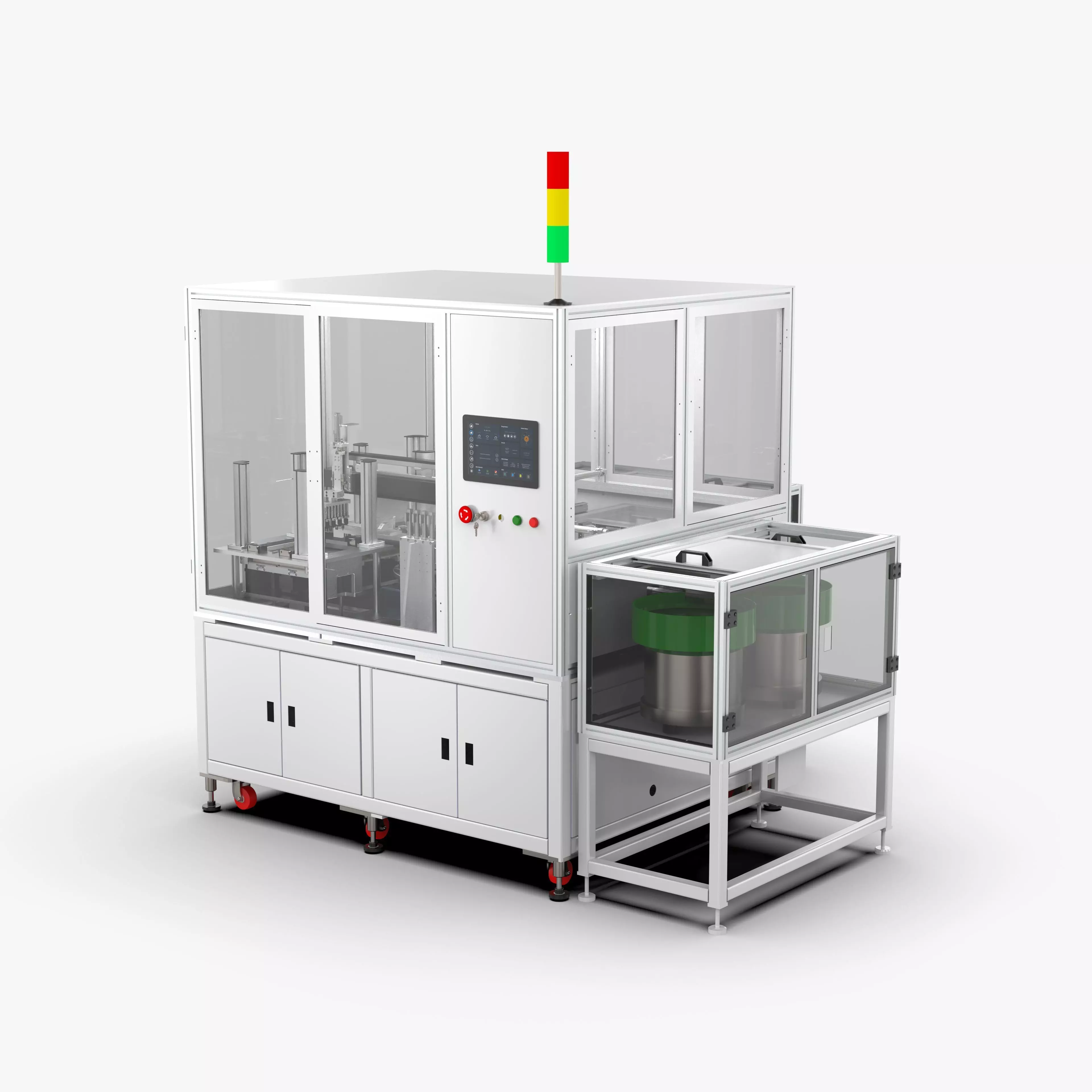 The spring distributing and assembly swinging machine is used for the assembly and swinging of springs and auxiliary small parts such as pin shafts and levers. The spring and lever vibrating plate are arranged for feeding, rotating for distributing, and servo for transferring and unloading. The main mechanisms include: spring and lever vibrating plate feeding mechanism, spring and lever rotating material distribution mechanism, spring lever assembly mechanism, post-assembly compression mechanism, 6-station turntable assembly, tooling jacking mechanism, servo transfer and lowering Material swinging mechanism, storage tray switching jacking components, rack cover, etc. The structure is complex, the feature size is complete and editable.