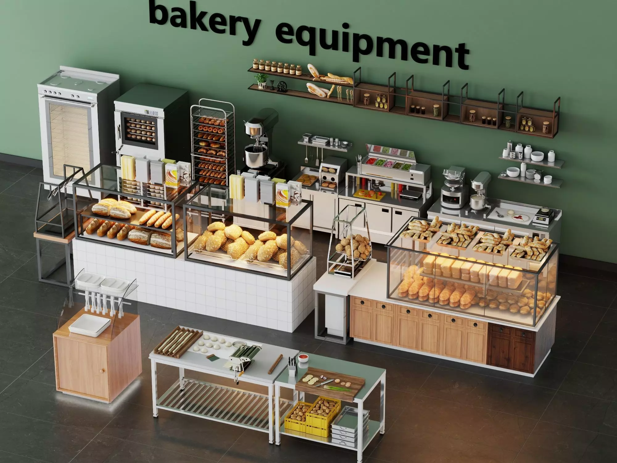 High-quality pack of professional bakery and commercial food display equipment 3D models, featuring: glass display cases with multi-tier shelves, ovens, mixers, proofers, prep tables, rolling racks, storage cabinets, utensil holders, bread trays, and detailed baking/pastry shop props.Models built to real-world scale with high detail — realistic stainless steel reflections, glass transparency, metal rack welds, wooden accents, subtle grease/wear marks, and authentic bakery/cafe realism.Full PBR workflow with high-res textures (2K-4K): Albedo, Roughness, Metallic, Normal, AO maps for realistic metal shine, glass clarity, surface variation, and depth in any lighting.Ideal for:• Architectural visualization and bakery/cafe renders• Commercial kitchen, pastry shop, and food retail builds• Baking simulation and hospitality scenes• Game assets (Unity/Unreal ready)• VR/AR food service and shop experiences• VFX, promotional videos, interior designOptimized polycount for real-time — drag and drop to enhance scenes instantly.Compatible formats:MAX (with materials), OBJ, FBXCompatible with 3ds Max, Maya, Blender, Cinema 4D, Unity, Unreal Engine, and more.