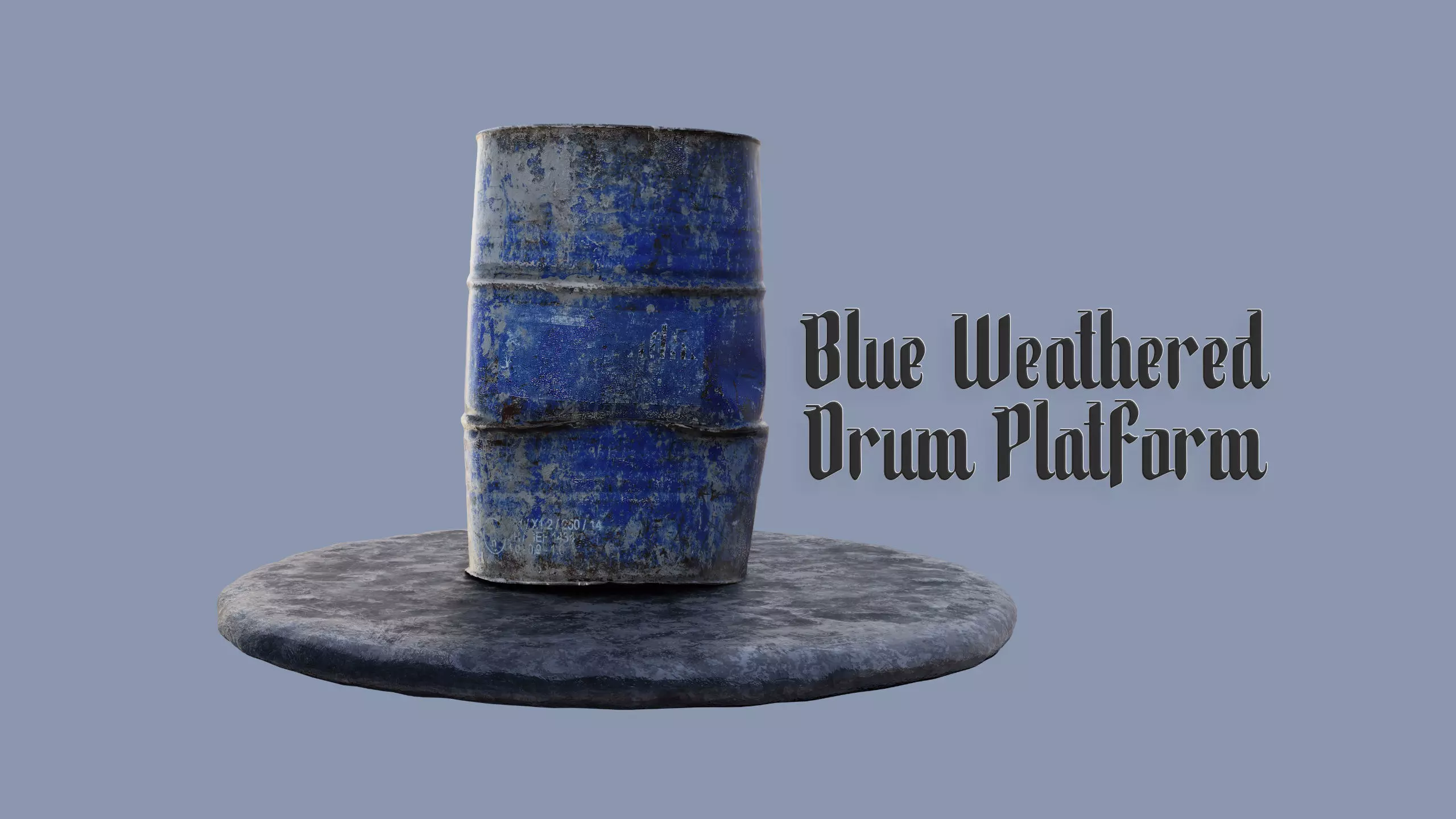 High-quality weathered drum platform 3D model featuring realistic wear and aging effects. This industrial asset includes a distressed blue oil drum positioned on a circular concrete platform, perfect for post-apocalyptic, industrial, or urban environments.