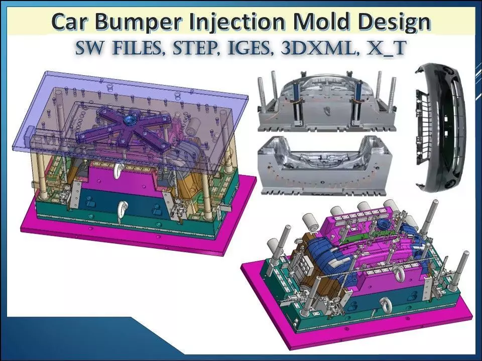 High-precision car bumper injection mold 3D CAD model developed for manufacturing automotive plastic bumpers with consistent quality and dimensional accuracy. The mold design reflects production-grade tooling standards, suitable for OEM and Tier-1 automotive suppliers.Key Features• Dedicated automotive bumper injection mold design• Precision cavity and core for accurate bumper geometry• Robust mold base for high-volume production cycles• Optimized parting lines for clean surface finish• Designed to support complex bumper contours and styling• Ejector system layout suitable for large plastic components• Clean, structured CAD model for tooling validation and simulationMold Design Highlights• Suitable for large plastic parts like front or rear bumpers• Stable clamping and alignment for repeatable molding• Compatible with standard automotive thermoplastics• Ready for mold-flow analysis and manufacturing detailingTypical Applications• Passenger car front and rear bumpers• Automotive exterior plastic components• Injection molding tool design & simulation• OEM and Tier-1 automotive production lines• Tooling development and cost estimation