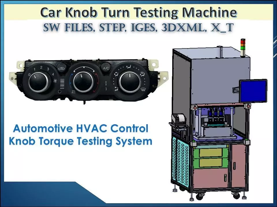 Key Features• Automated rotary knob testing mechanism• Precise torque and rotational resistance measurement• Adjustable testing cycles for durability simulation• Fixture designed for automotive HVAC control panels• Programmable test parameters and cycle count• Stable industrial frame for vibration-free testing• Data recording for quality inspection• Detailed 3D CAD model for machine design and automation integration