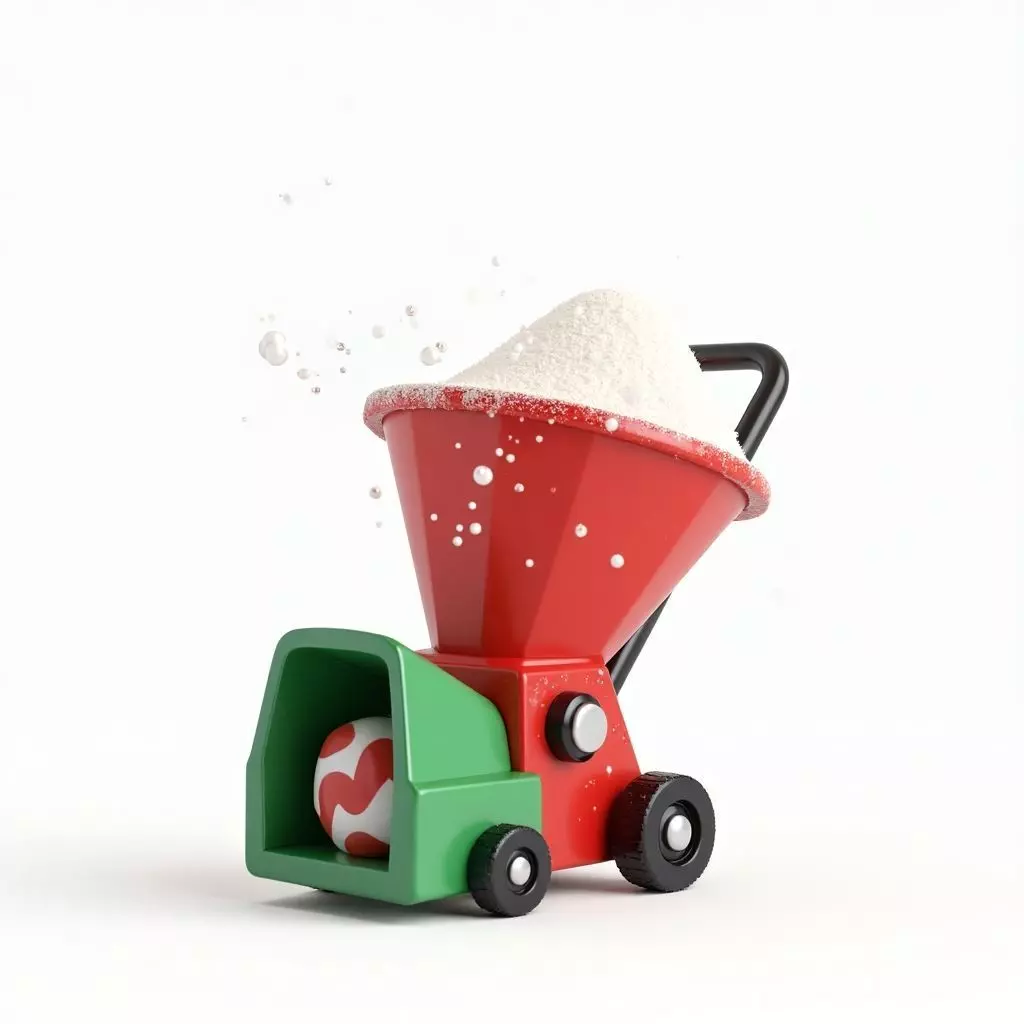 The model depicts a stylized piece of equipment, rendered in bright, traditional holiday colors of red and green. The large red hopper is overflowing with soft white, stylized snow, which is shown being dispersed. The body is simple and blocky, featuring black wheels and handles. A small, patterned Christmas ornament or snowball is visible near the front scoop, adding an extra festive touch. The smooth, clean, stylized finish makes it suitable for lighthearted holiday content.