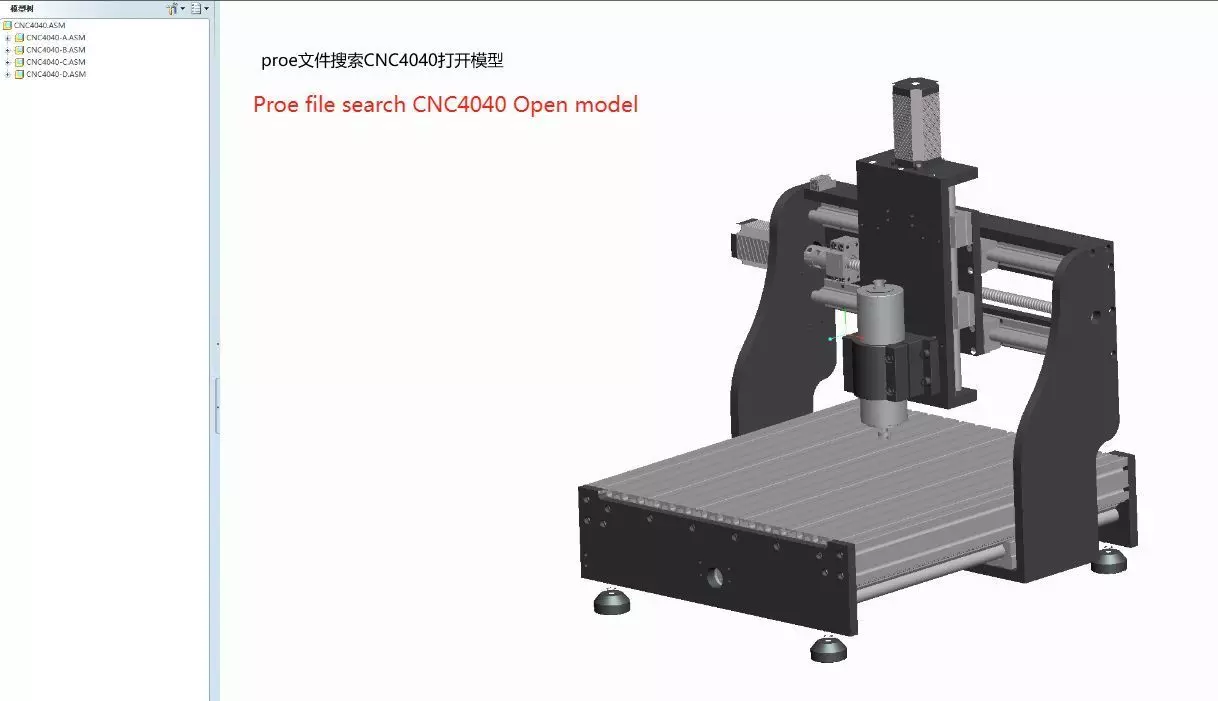 Proe file search CNC4040 Open model. Engraving from the processing principle is a combination of drilling and milling processing, engraving machine a variety of data input mode according to the need to ease. Computer engraving machine has two categories of laser engraving and mechanical engraving, both of which have high power and small power. Because the application range of engraving machine is very wide, it is necessary to understand the most suitable application range of various engraving machines. Low power is only suitable for two-color panels, architectural models, small signs, three-dimensional crafts and so on. Because the power is too small, it greatly affects the range of its application. High power engraving machine can do small power engraving machine things. Most suitable for large cutting, relief, engraving.
