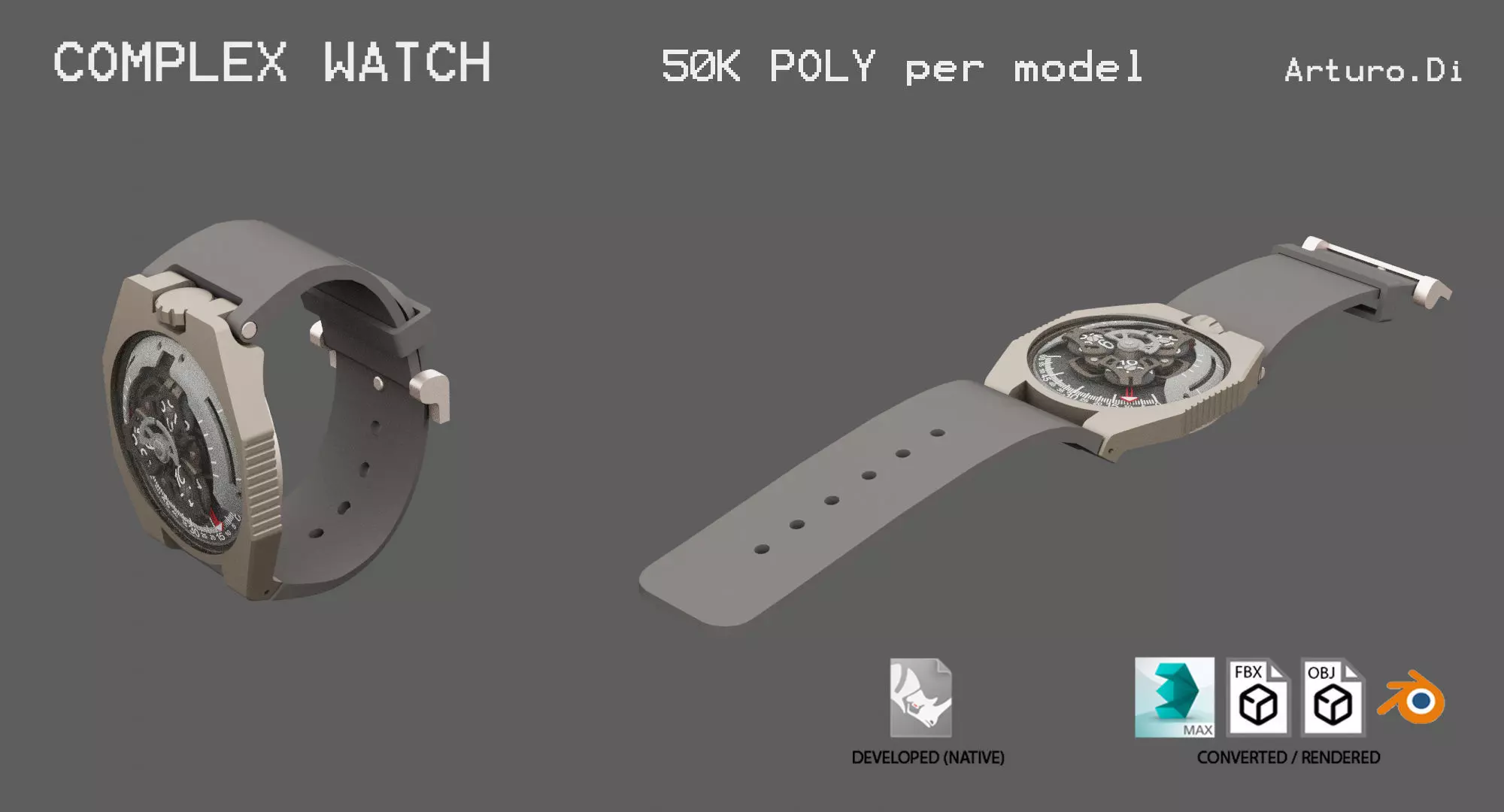 A very detailed hard surface model of a watch including hardware details like screws and buttons on a leather strap. This product contains a detailed wrist watch with a closed position as well as in an open position.