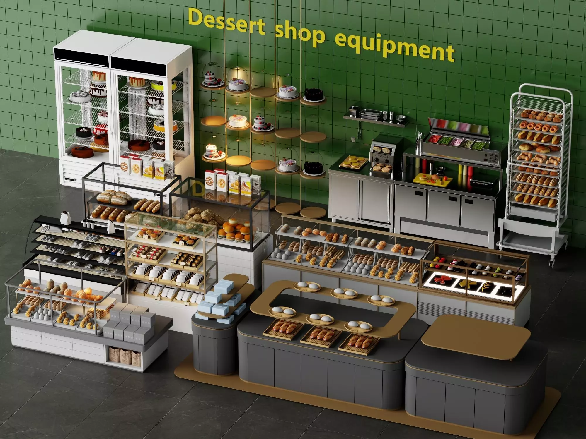 High-quality pack of professional dessert shop and bakery display equipment 3D models, featuring: multi-tier glass display cases with LED lighting, refrigerated showcases, prep counters, wall-mounted shelves, rolling racks, pastry trays, storage cabinets, utensil holders, and detailed food retail/pastry shop props.Models built to real-world scale with high detail — realistic glass transparency/reflections, stainless/metal frame welds, wooden accents, subtle lighting glow, clean/wear textures, and authentic cafe/dessert shop realism.Full PBR workflow with high-res textures (2K-4K): Albedo, Roughness, Metallic, Normal, AO maps for realistic glass clarity, metal shine, surface variation, and depth in any lighting.Ideal for:• Architectural visualization and bakery/cafe renders• Dessert shop, pastry counter, and food retail builds• Commercial food service and hospitality scenes• Game assets (Unity/Unreal ready)• VR/AR shop experiences and virtual retail tours• VFX, promotional videos, interior designOptimized polycount for real-time — drag and drop to enhance scenes instantly.Compatible formats:MAX (with materials), OBJ, FBXCompatible with 3ds Max, Maya, Blender, Cinema 4D, Unity, Unreal Engine, and more.