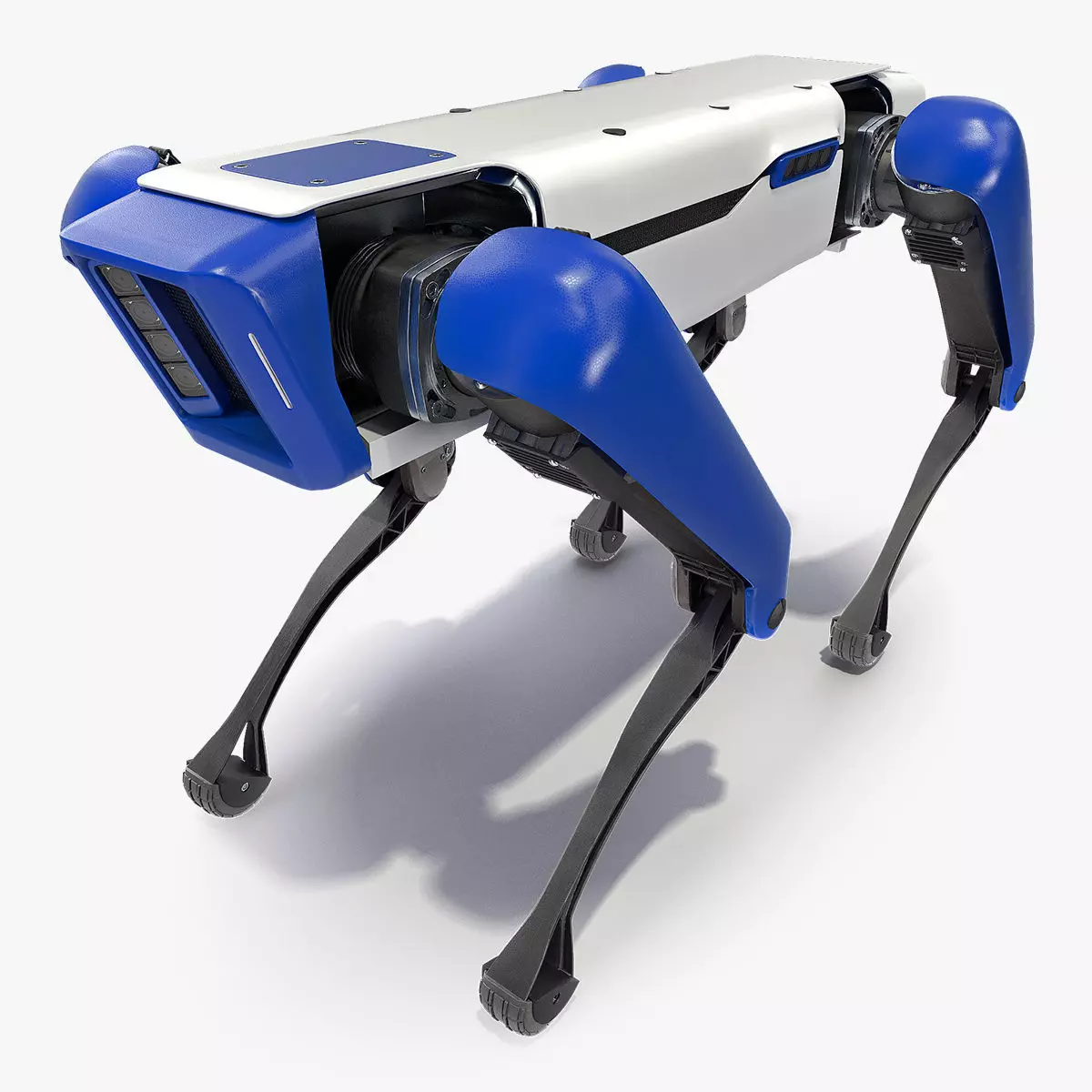 Blue, white and black mini domestic high tech dog-like cute and helpful bot device with artificial intelligence features.For robotic technologies, sophisticated machinery, mechanic engineering, automation engineering, sci fi media, sci fi entertaining, robotics equipment, cyborg robotics, robotics solutions, and domestic robots projects design.
