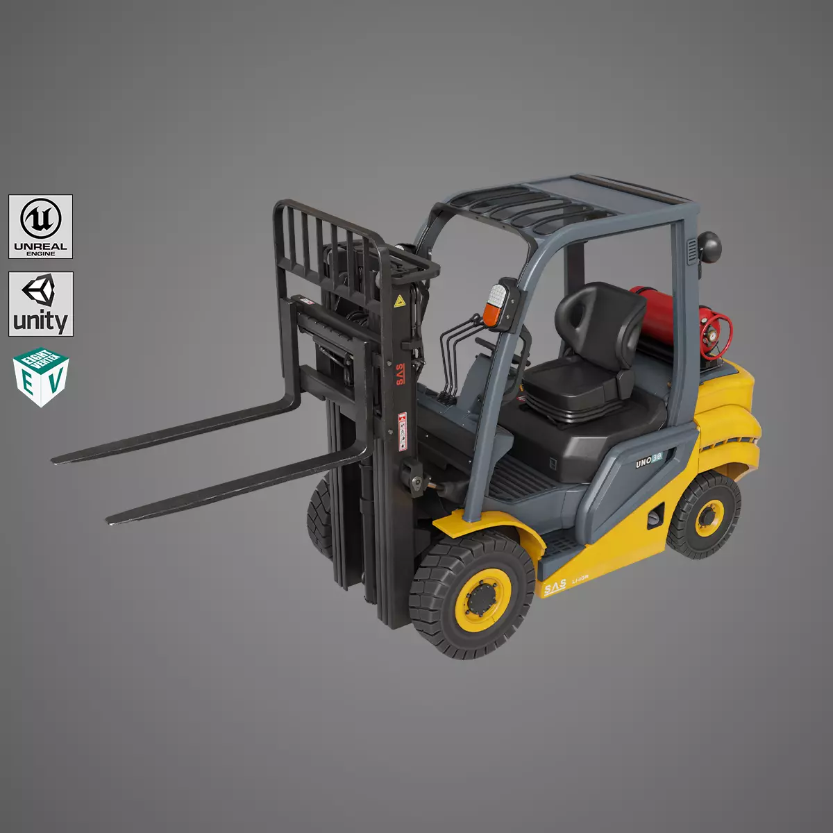 The Photorealistic 3D Model of Forklift Truck 02 Yellow Rigged Generic 3D Model. This model is suitable for any visual production - broadcast, high-res film close-ups, advertising, games, design visualization, forensic presentation, etc.