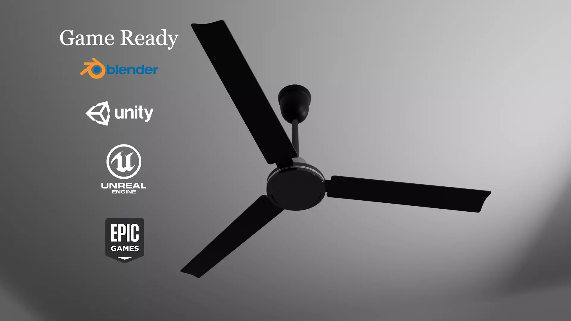 This is a high-quality, game-ready 3D model of a modern black ceiling fan, carefully optimized for real-time engines and 3D visualization projects. The model features a realistic cylindrical motor housing, sleek aerodynamic blades, and accurate proportions suitable for architectural visualization, interior design renders, and interactive applications.