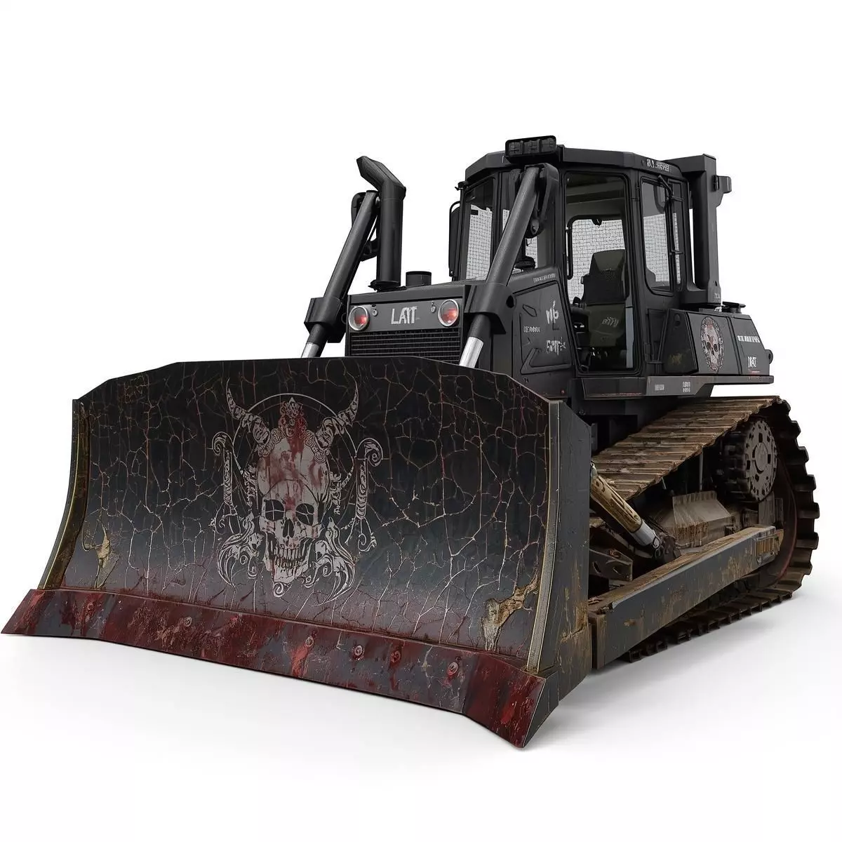 Tagshorror bulldozer, haunted machinery, heavy equipment, gothic design, skull engraving, weathered, 3d model, game asset, dark fantasy, rusted, industrial horror, macabre, cinematic prop, realistic, creepy, construction vehicle, demonic, supernatural, blood stained, 3d prop