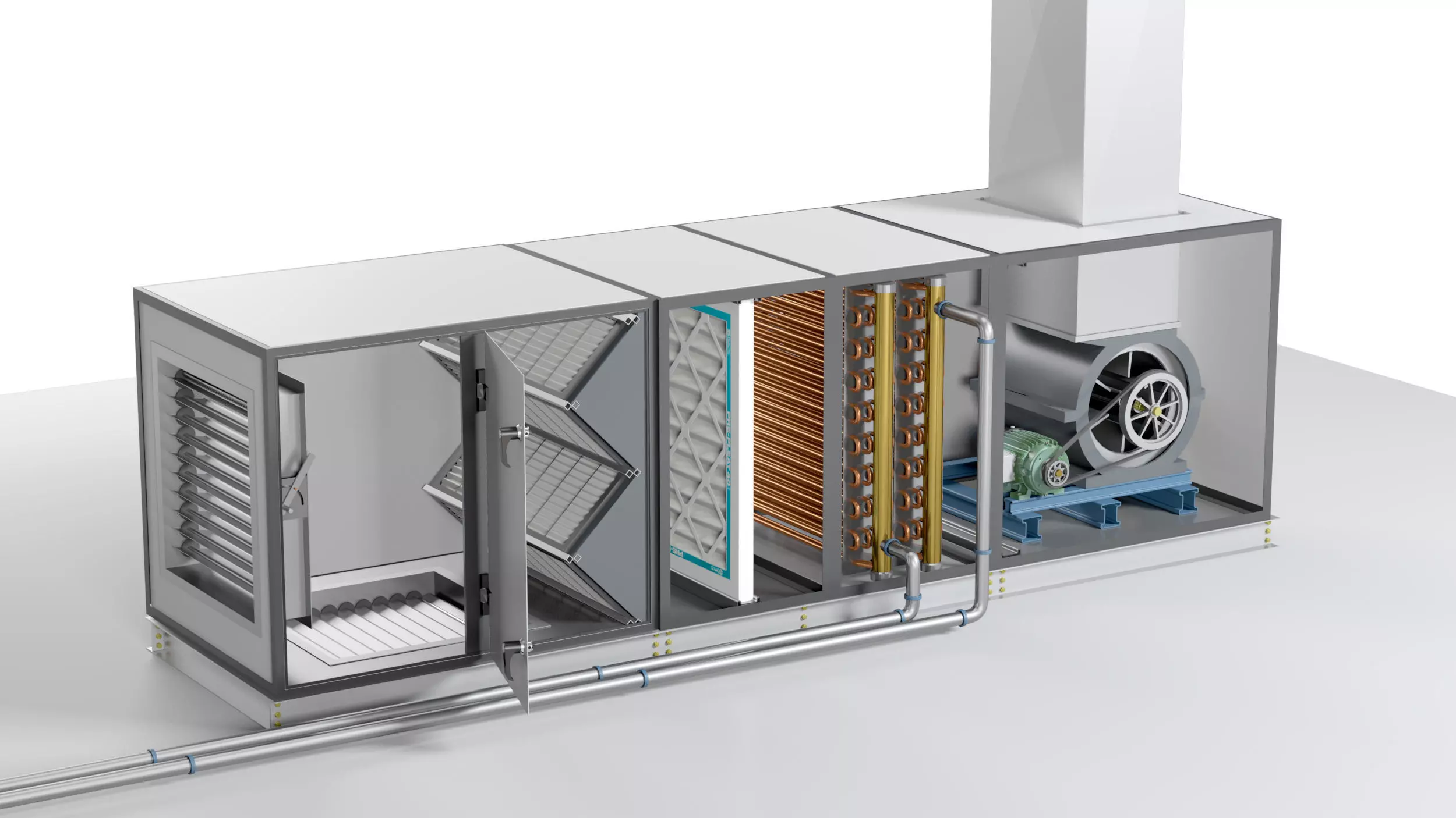 A highly detailed, photo-realistic 3D model of a typical Commercial Air Handling Unit (AHU) shown in a cutaway view. This model is perfect for architectural visualizations, HVAC engineering presentations, educational materials, or product demonstrations.Key Features / Components Visible: