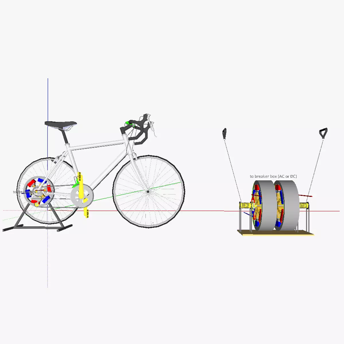 3D model of the human powered electricity generators for ODWHES. The first HP electricity generator is a regular road bicycle which has the back wheel removed and is directly placed on the axle of the electricity genertator. The chain of the bicycle is placed on the gears (same gears as on the bicycle wheel) on the axle of the electricity generator.