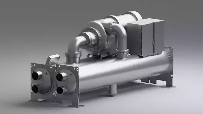 Chiller unit used in cooling and thermal energy systems to produce chilled water for HVAC and industrial cooling applications.This model represents a typical water chiller configuration used in central cooling plants.It is not modeled to real-world engineering specifications and is intended for visual and conceptual use only.